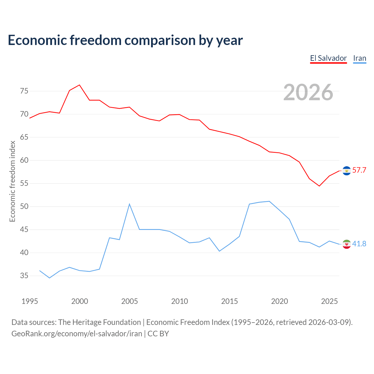 Data sources: The Heritage Foundation | Economic Freedom Index (1995–2026, retrieved 2026-03-09).
