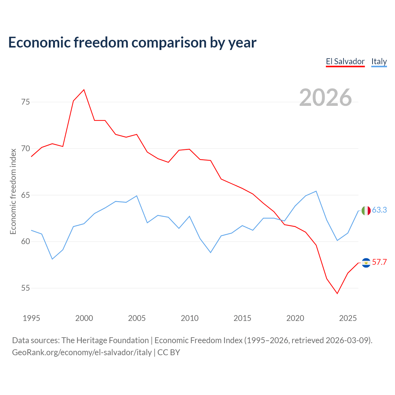The Economic Freedom Index for El Salvador is 57.7, ranking 114/197, compared to 63.3 for Italy, ranking 80/197. The chart above displays a comparison of annual changes in economic freedom indexes.