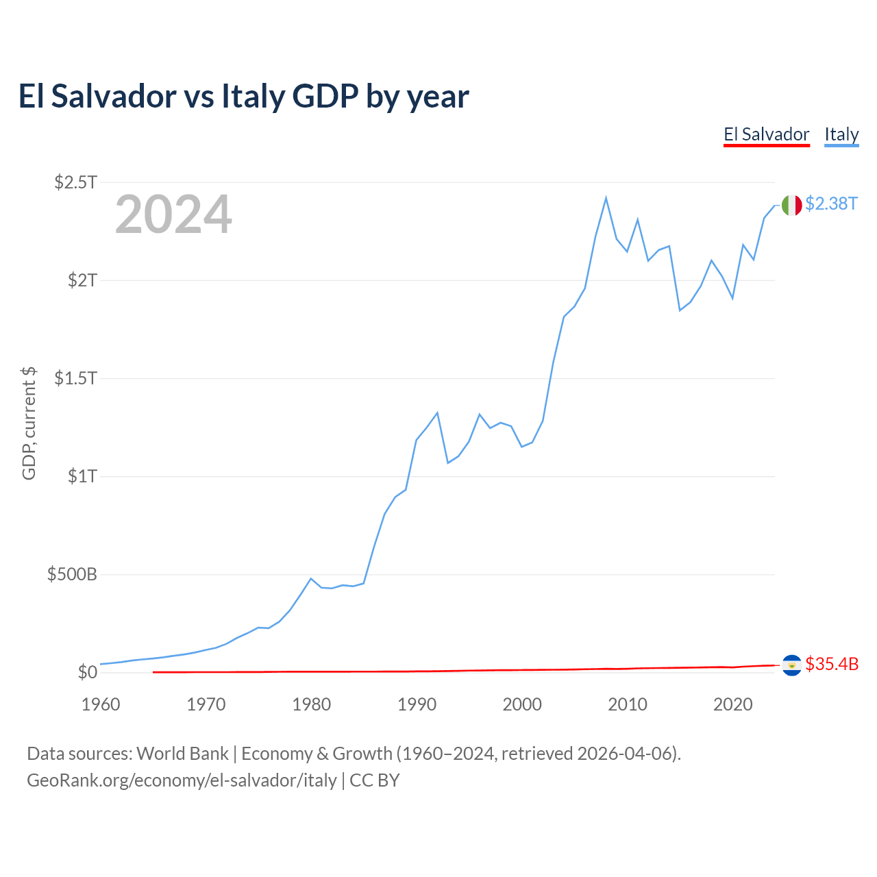 El Salvador has a GDP of $35.4B compared to $2.38T for Italy, ranking 105/197 and 8/197 by economy size, respectively.