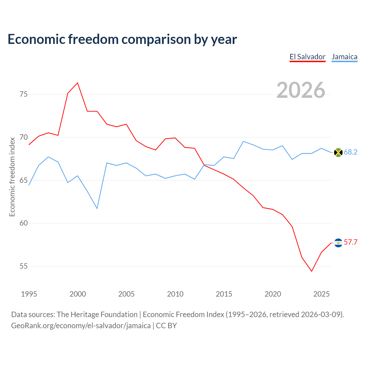 The Economic Freedom Index for El Salvador is 57.7, ranking 114/197, compared to 68.2 for Jamaica, ranking 48/197. The chart above displays a comparison of annual changes in economic freedom indexes.