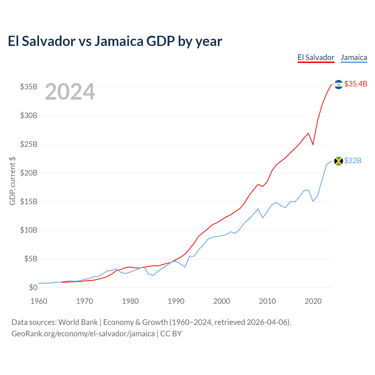 El Salvador has a GDP of $35.4B compared to $22B for Jamaica, ranking 105/197 and 124/197 by economy size, respectively.