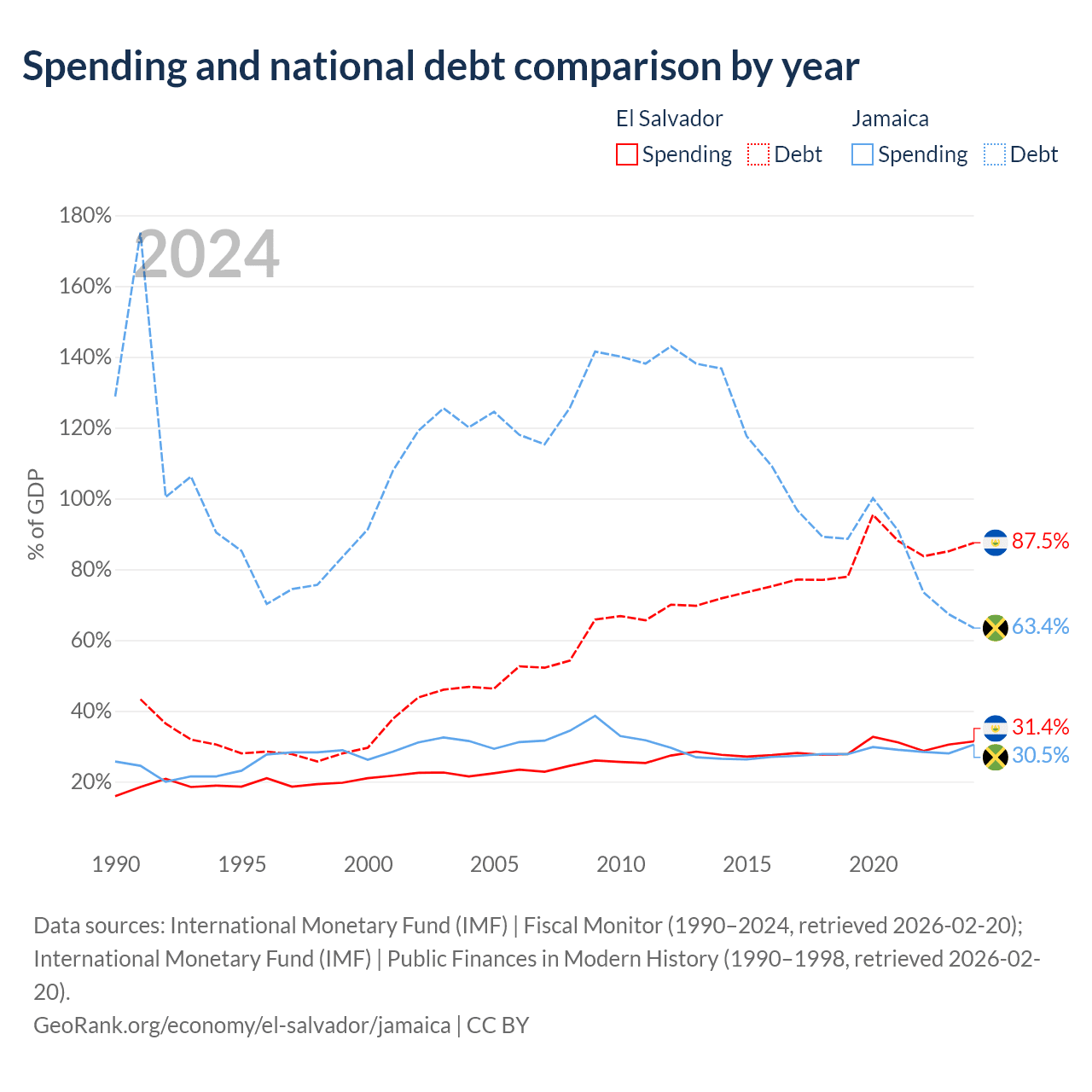 El Salvador has $30.9B in government debt (87.5% of GDP), compared to $14B (63.4% of GDP) in Jamaica.