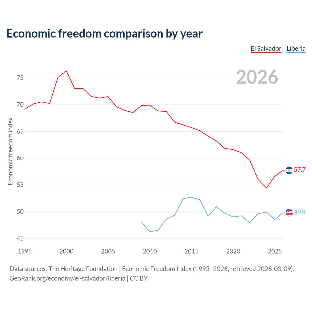 The Economic Freedom Index for El Salvador is 57.7, ranking 114/197, compared to 49.8 for Liberia, ranking 163/197. The chart above displays a comparison of annual changes in economic freedom indexes.