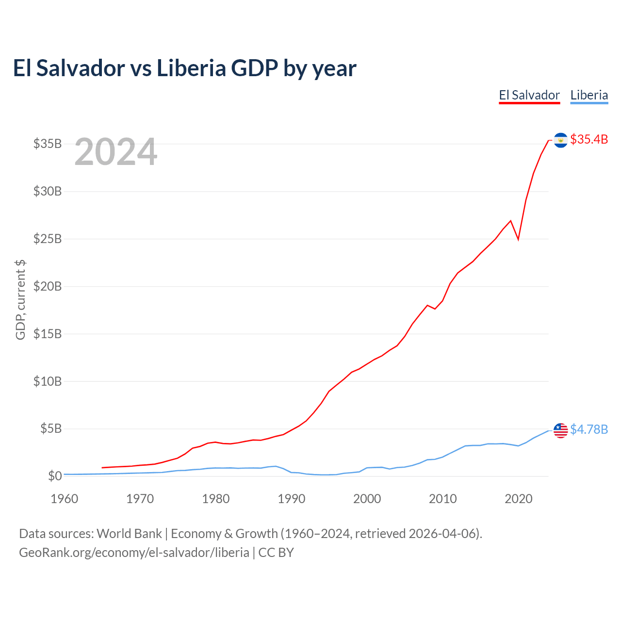 El Salvador has a GDP of $35.4B compared to $4.78B for Liberia, ranking 105/197 and 163/197 by economy size, respectively.