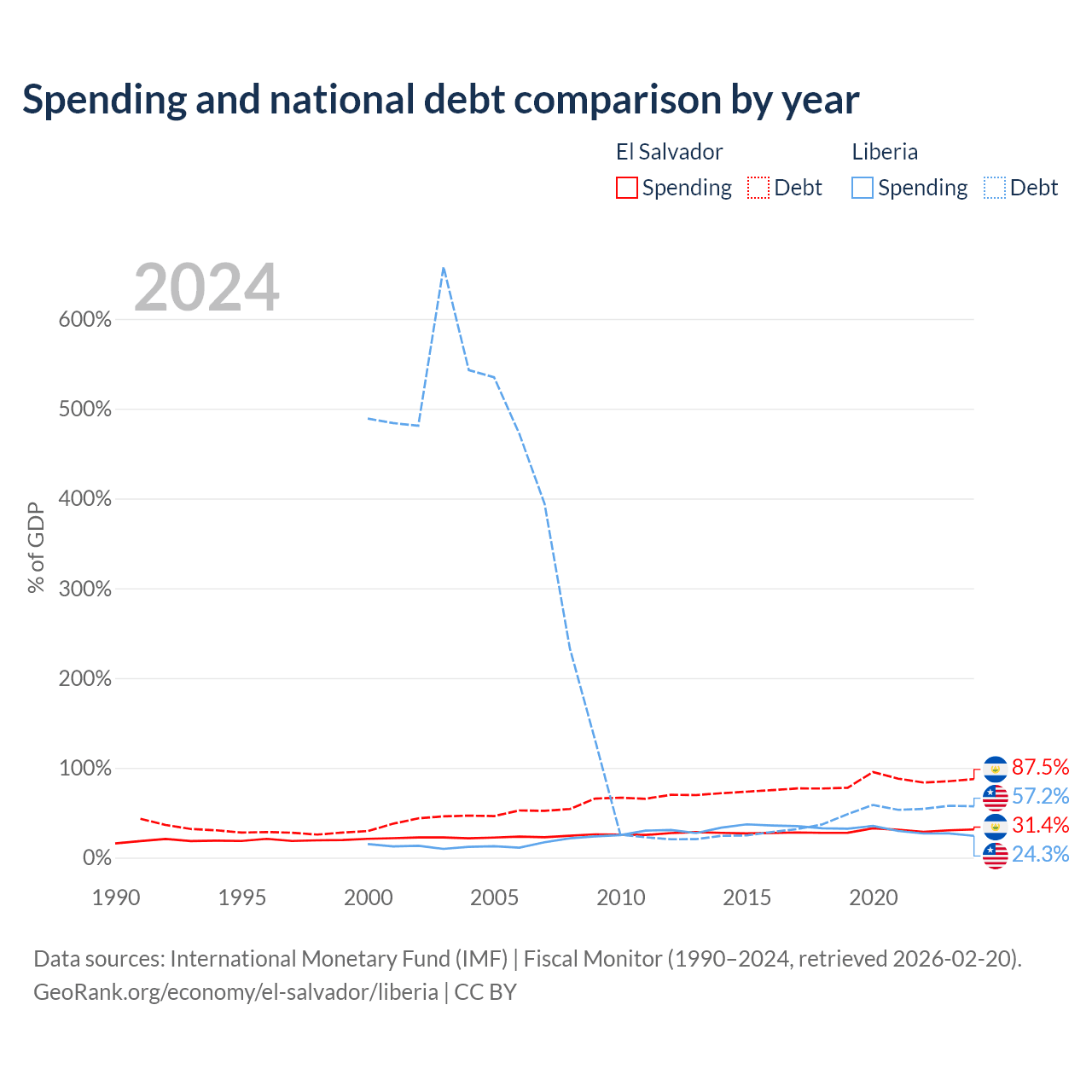 El Salvador has $30.9B in government debt (87.5% of GDP), compared to $2.73B (57.2% of GDP) in Liberia.