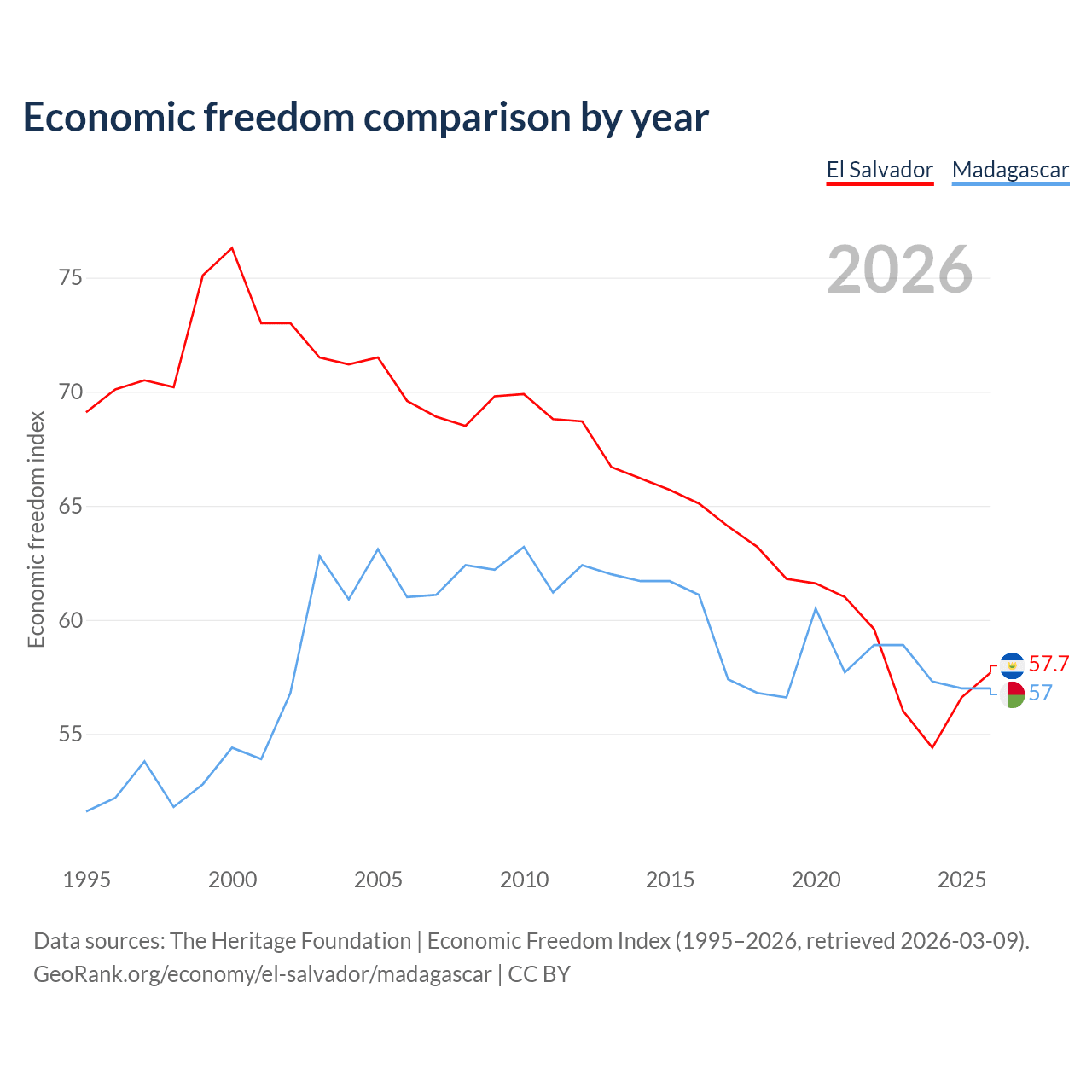 The Economic Freedom Index for El Salvador is 57.7, ranking 114/197, compared to 57 for Madagascar, ranking 119/197. The chart above displays a comparison of annual changes in economic freedom indexes.