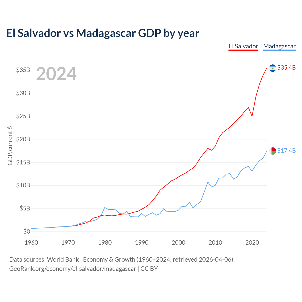 El Salvador has a GDP of $35.4B compared to $17.4B for Madagascar, ranking 105/197 and 136/197 by economy size, respectively.