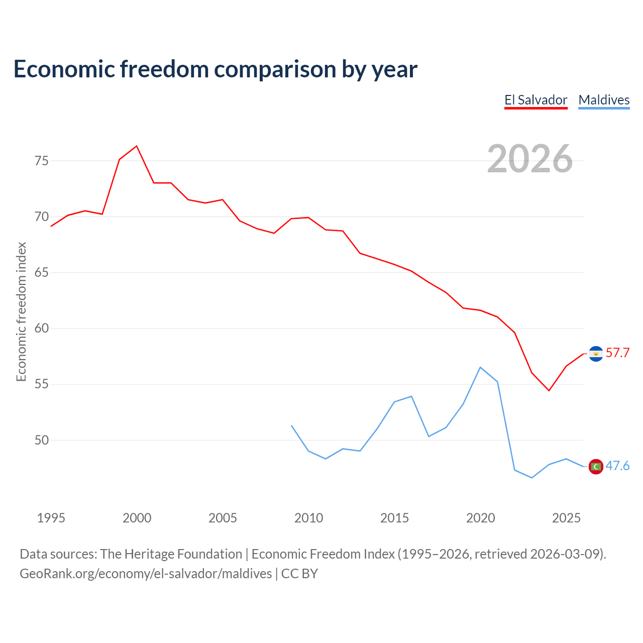 The Economic Freedom Index for El Salvador is 57.7, ranking 114/197, compared to 47.6 for Maldives, ranking 174/197. The chart above displays a comparison of annual changes in economic freedom indexes.