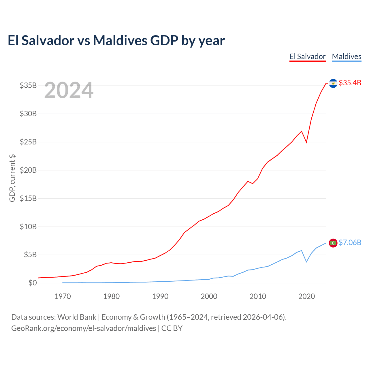 El Salvador has a GDP of $35.4B compared to $7.06B for Maldives, ranking 105/197 and 159/197 by economy size, respectively.