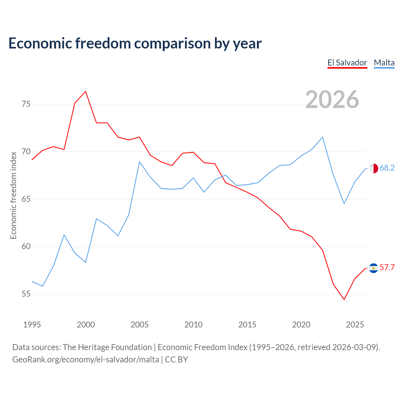 The Economic Freedom Index for El Salvador is 57.7, ranking 114/197, compared to 68.2 for Malta, ranking 49/197. The chart above displays a comparison of annual changes in economic freedom indexes.