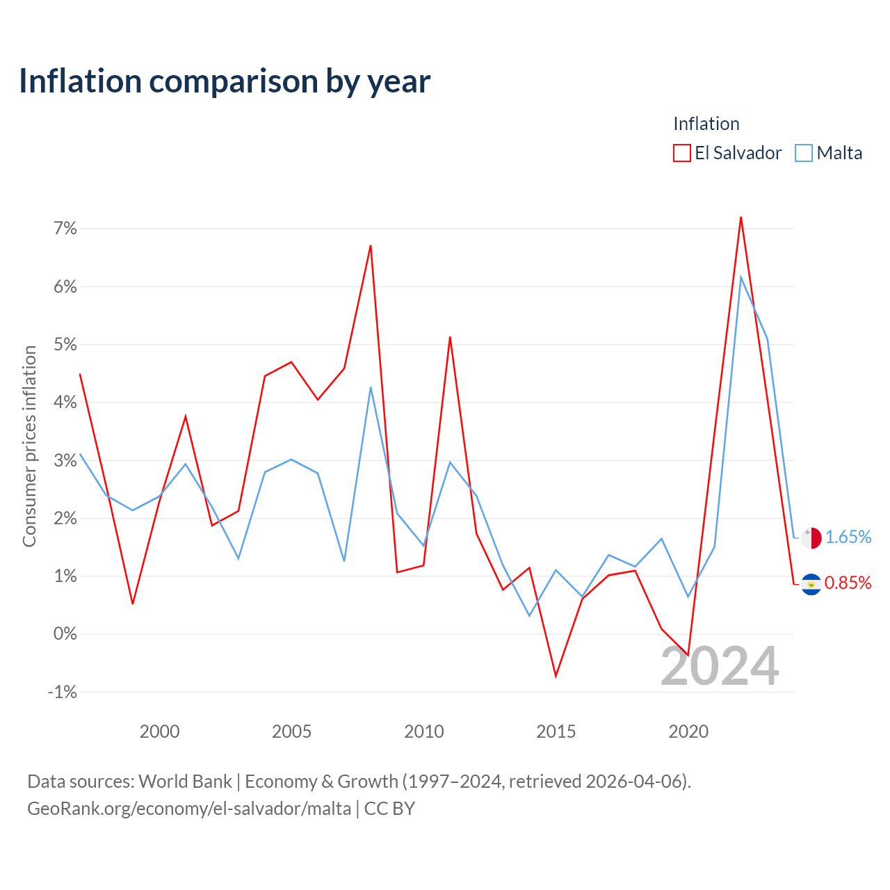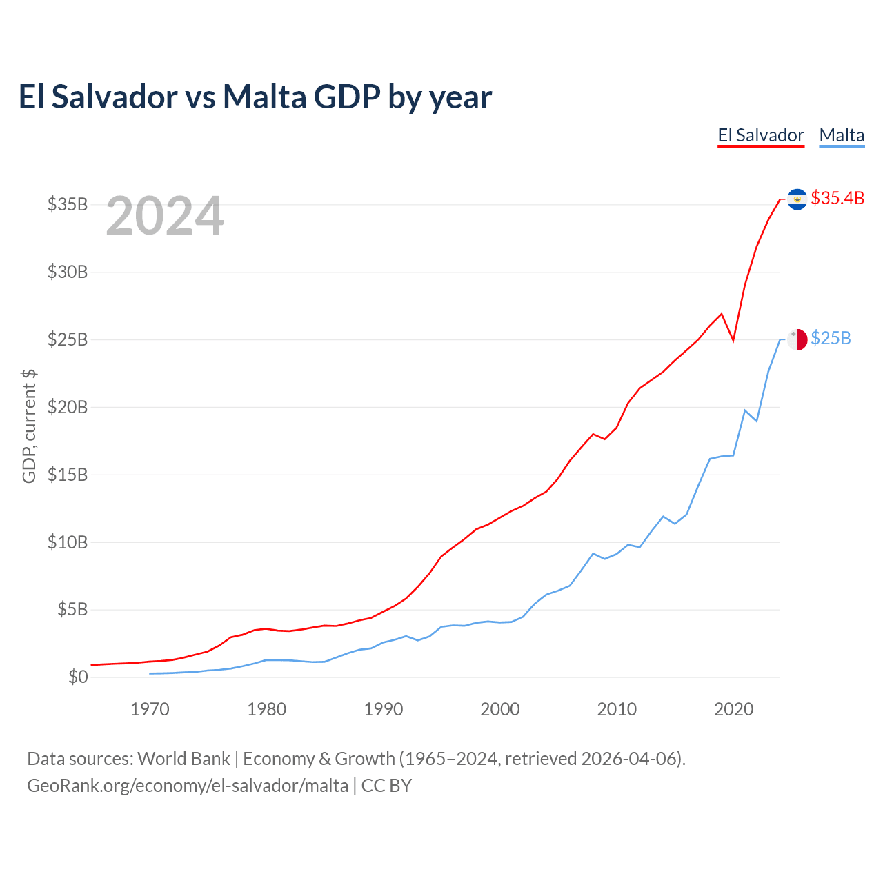 El Salvador has a GDP of $35.4B compared to $25B for Malta, ranking 105/197 and 119/197 by economy size, respectively.