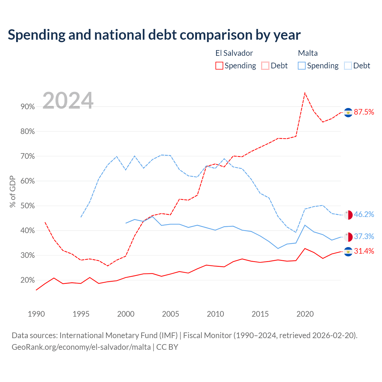 El Salvador has $30.9B in government debt (87.5% of GDP), compared to $11.5B (46.2% of GDP) in Malta.