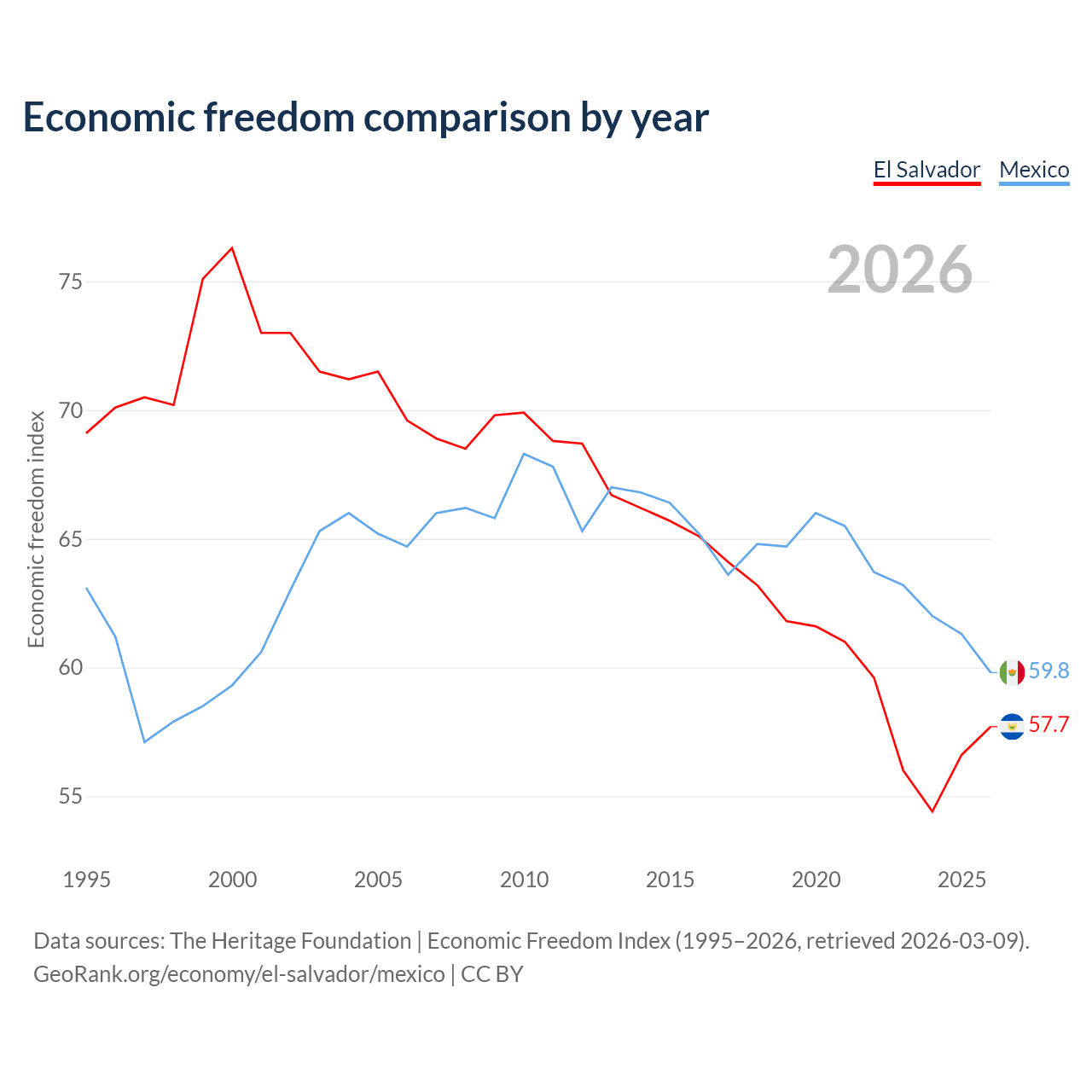 Data sources: The Heritage Foundation | Economic Freedom Index (1995–2026, retrieved 2026-03-09).