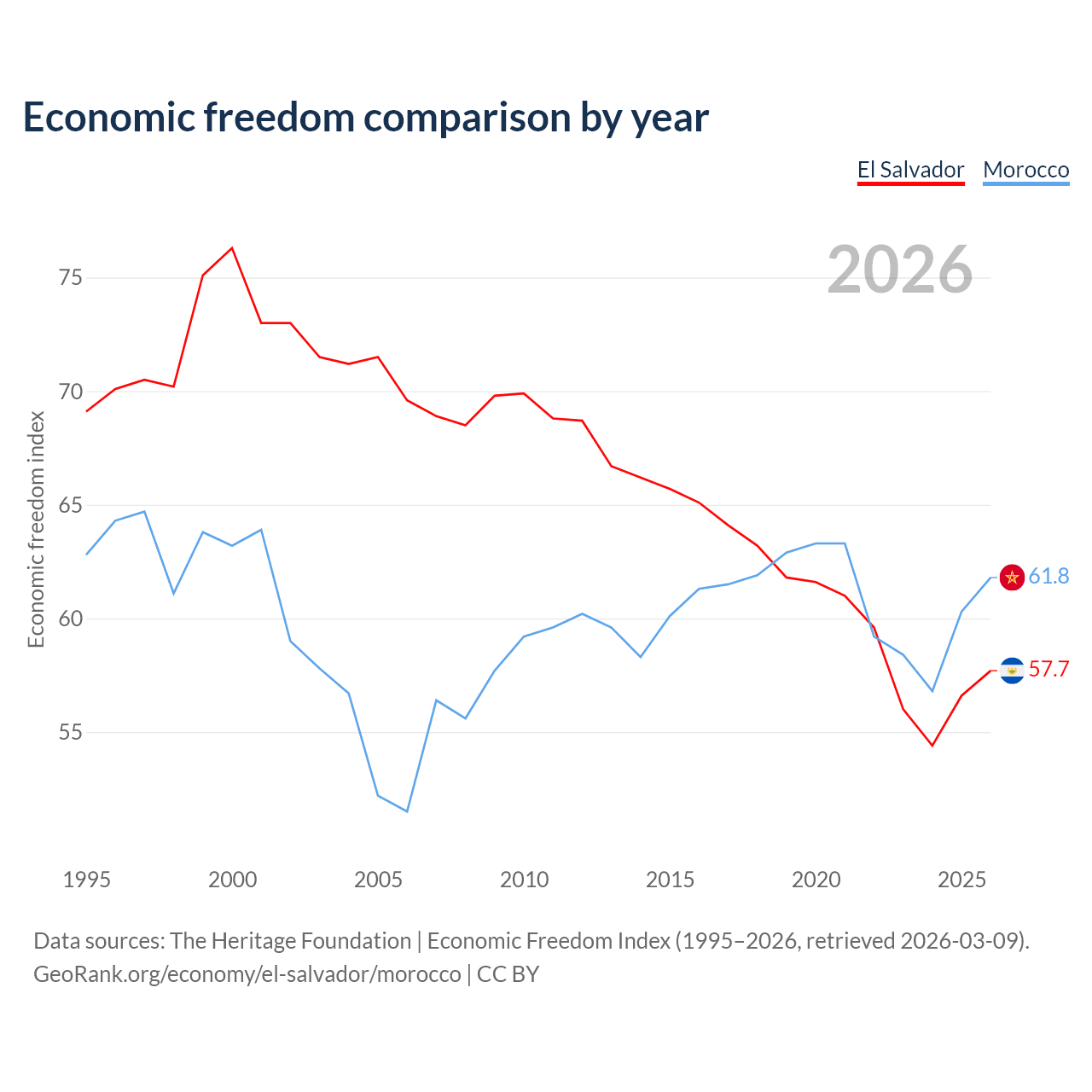 The Economic Freedom Index for El Salvador is 57.7, ranking 114/197, compared to 61.8 for Morocco, ranking 91/197. The chart above displays a comparison of annual changes in economic freedom indexes.