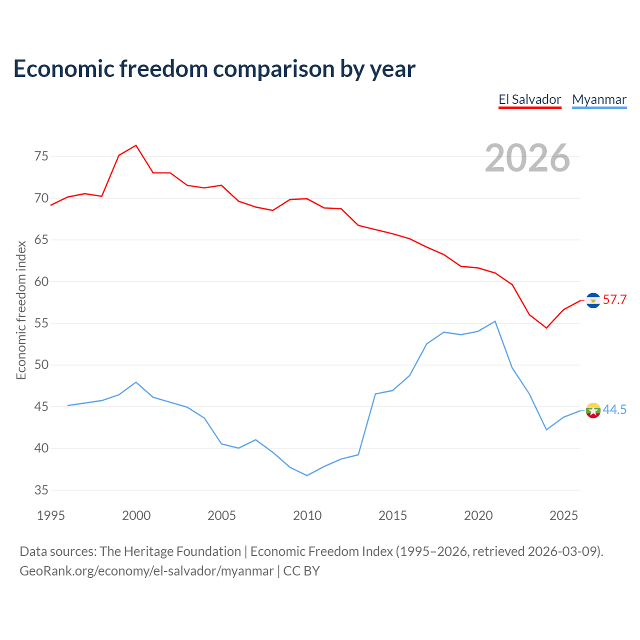 Data sources: The Heritage Foundation | Economic Freedom Index (1995–2026, retrieved 2026-03-09).