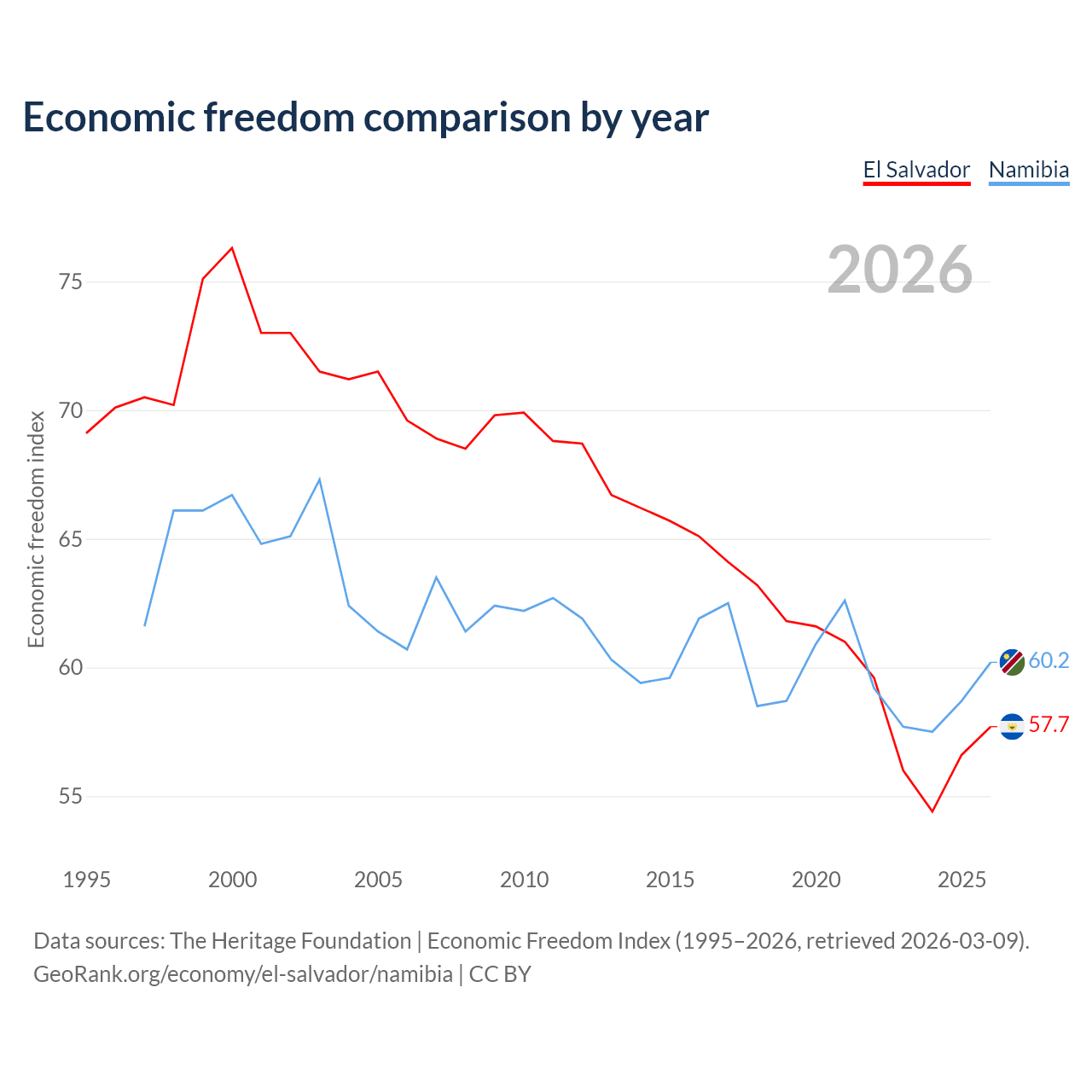 Data sources: The Heritage Foundation | Economic Freedom Index (1995–2026, retrieved 2026-03-09).