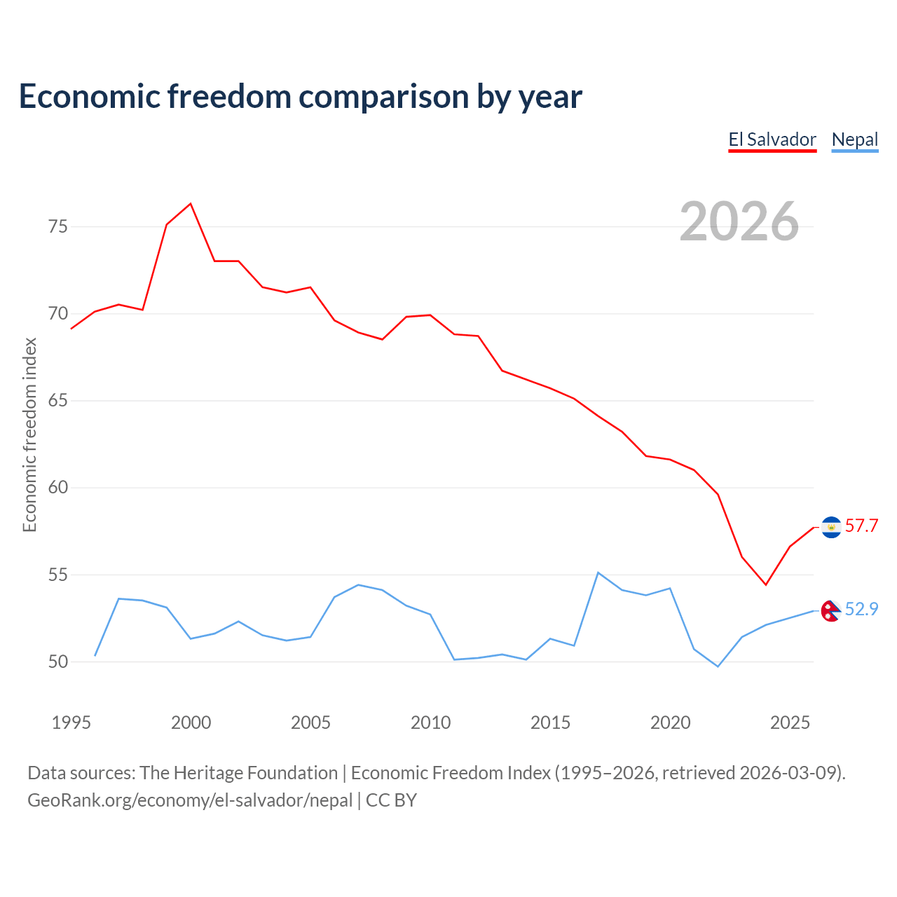Data sources: The Heritage Foundation | Economic Freedom Index (1995–2026, retrieved 2026-03-09).