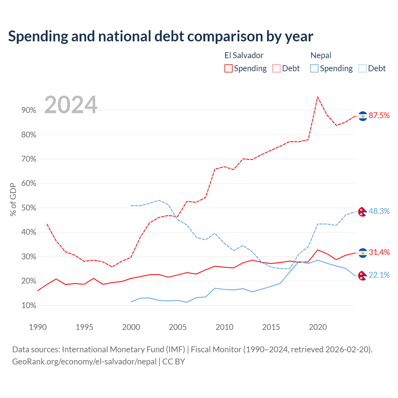 El Salvador has $30.9B in government debt (87.5% of GDP), compared to $20.7B (48.3% of GDP) in Nepal.