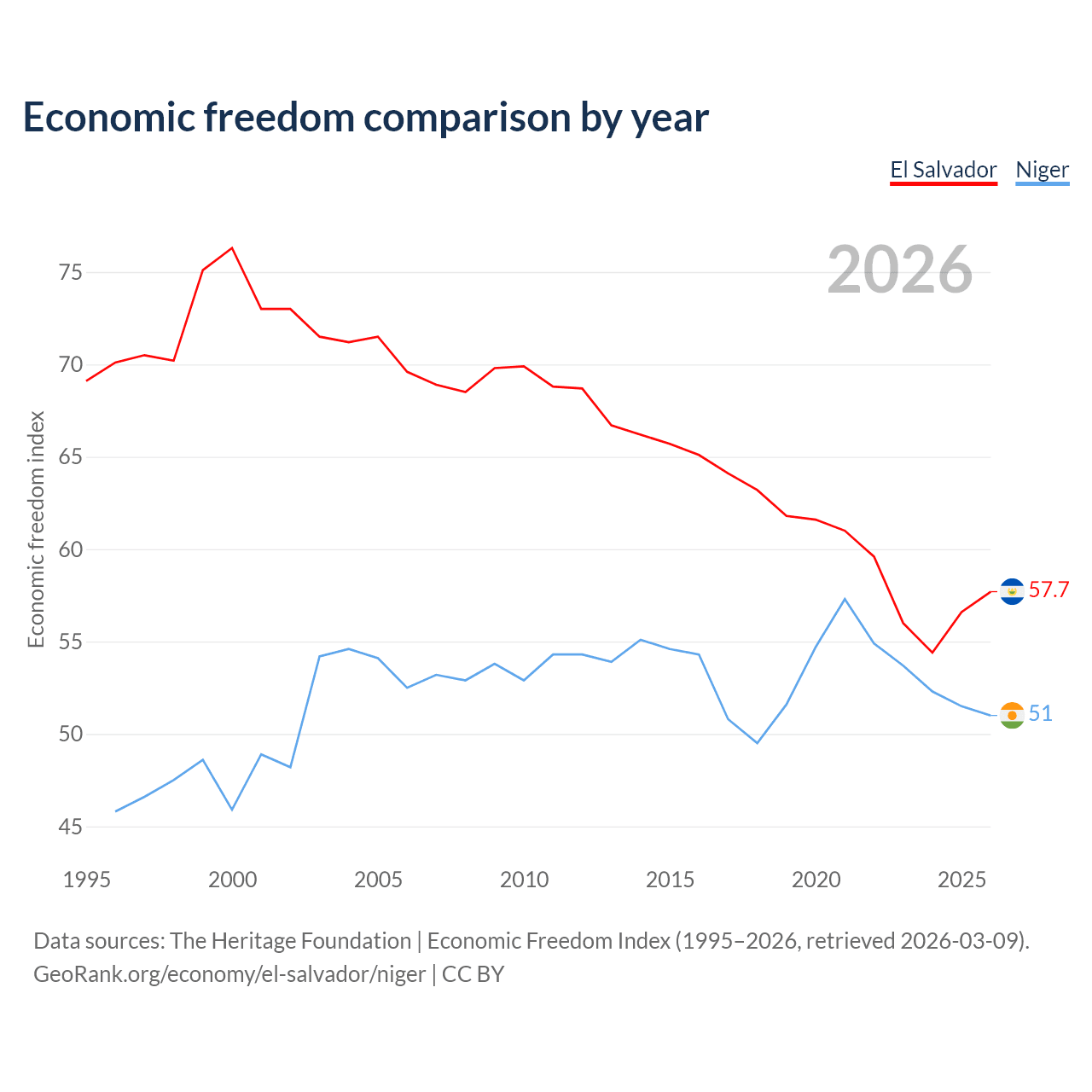 The Economic Freedom Index for El Salvador is 57.7, ranking 114/197, compared to 51 for Niger, ranking 156/197. The chart above displays a comparison of annual changes in economic freedom indexes.