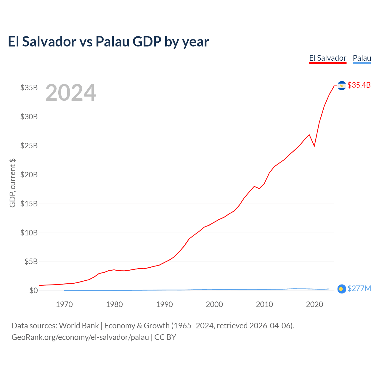 El Salvador has a GDP of $35.4B compared to $277M for Palau, ranking 105/197 and 194/197 by economy size, respectively.
