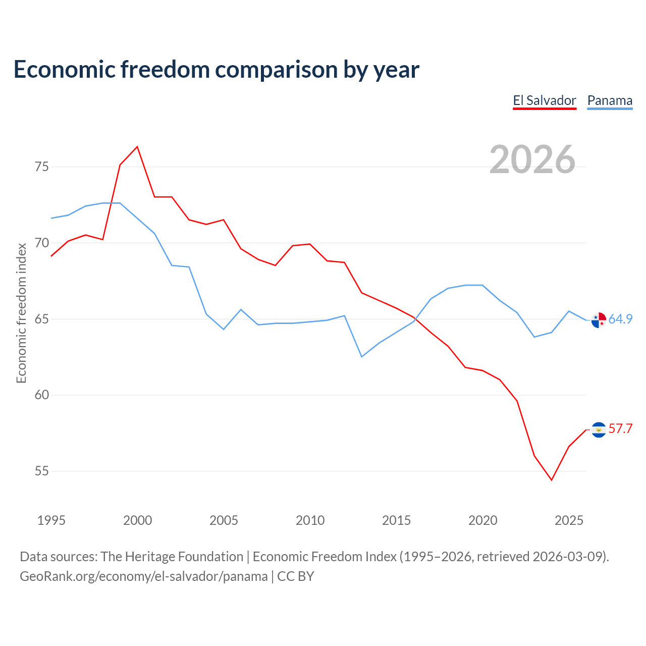 Data sources: The Heritage Foundation | Economic Freedom Index (1995–2026, retrieved 2026-03-09).