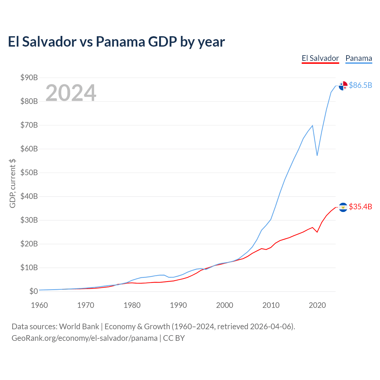El Salvador has a GDP of $35.4B compared to $86.5B for Panama, ranking 105/197 and 78/197 by economy size, respectively.