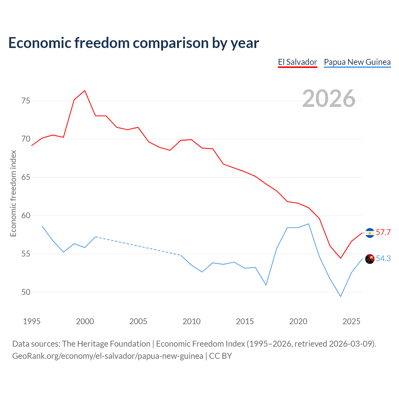 The Economic Freedom Index for El Salvador is 57.7, ranking 114/197, compared to 54.3 for Papua New Guinea, ranking 134/197. The chart above displays a comparison of annual changes in economic freedom indexes.