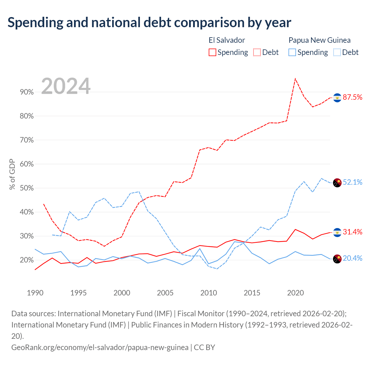 El Salvador has $30.9B in government debt (87.5% of GDP), compared to $16.6B (52.1% of GDP) in Papua New Guinea.