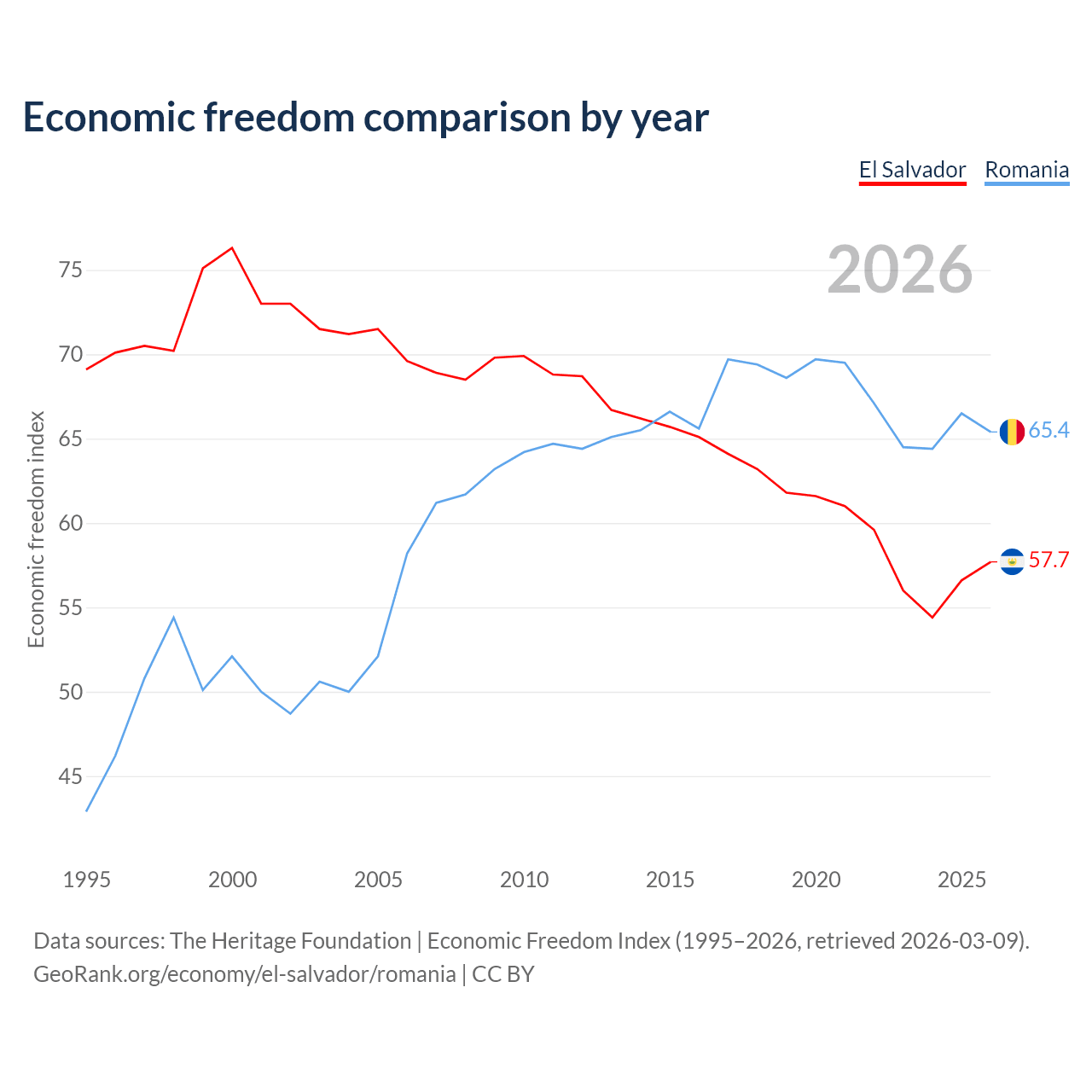 The Economic Freedom Index for El Salvador is 57.7, ranking 114/197, compared to 65.4 for Romania, ranking 64/197. The chart above displays a comparison of annual changes in economic freedom indexes.