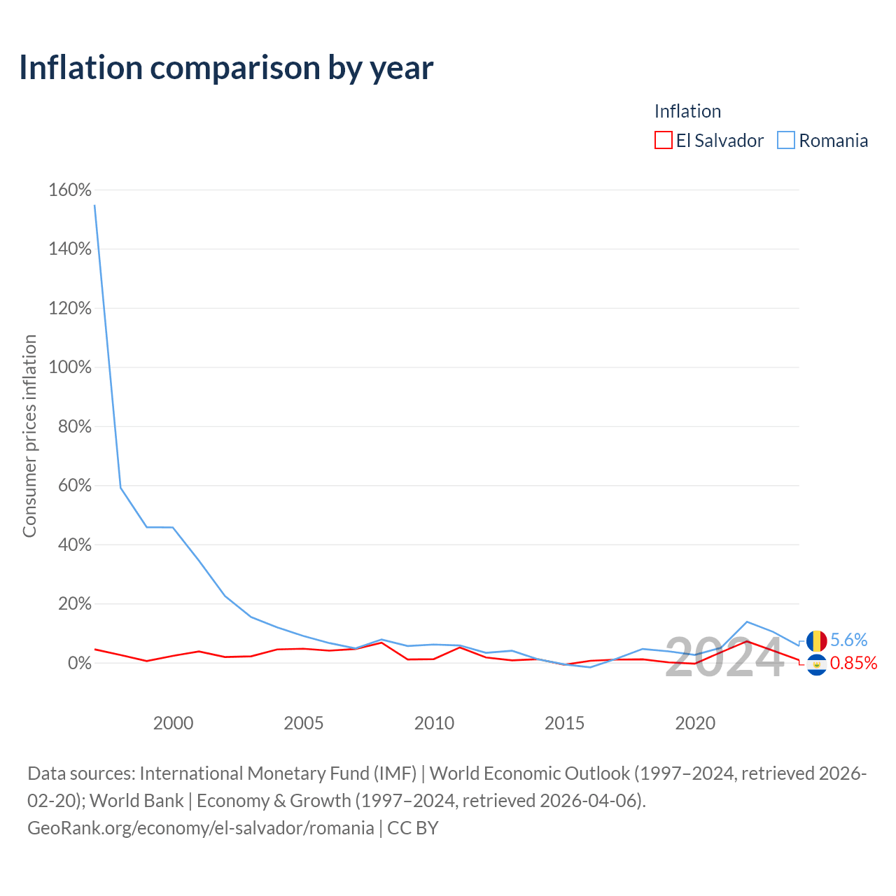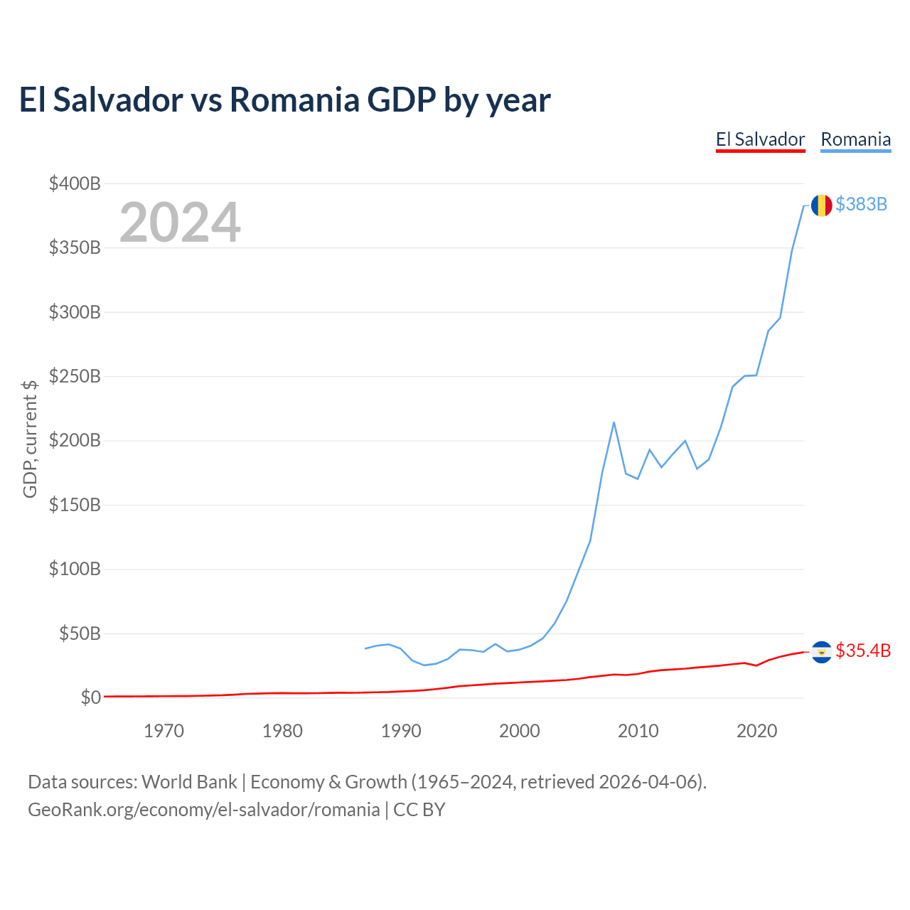 El Salvador has a GDP of $35.4B compared to $383B for Romania, ranking 105/197 and 42/197 by economy size, respectively.