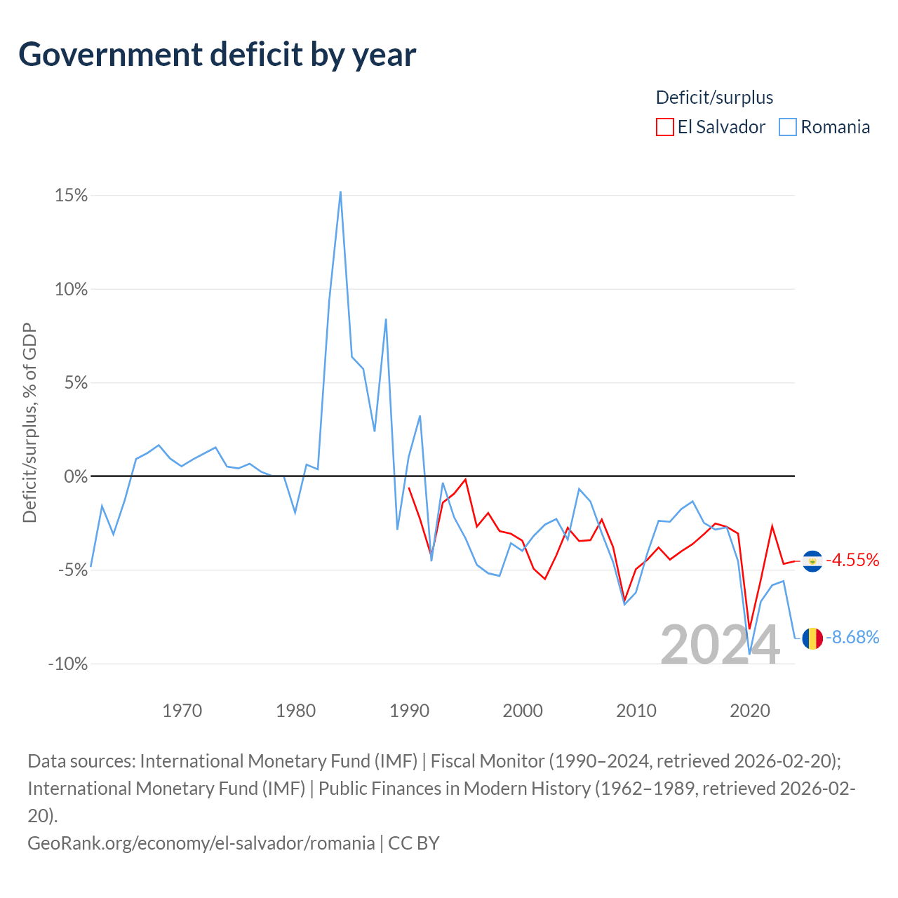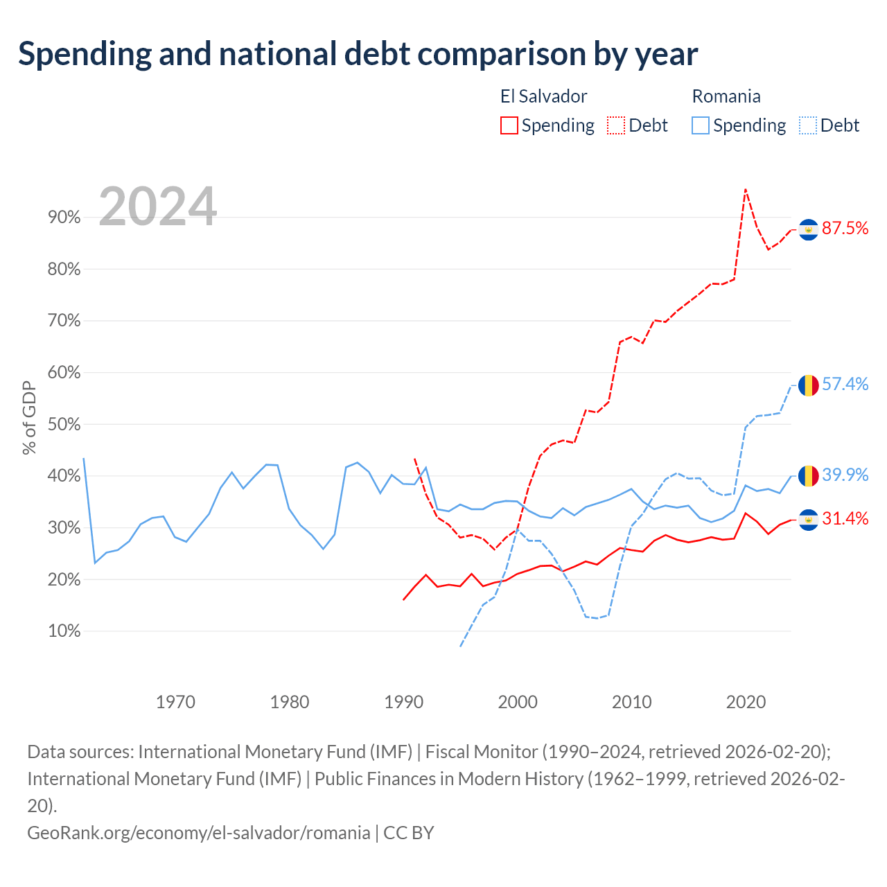 El Salvador has $30.9B in government debt (87.5% of GDP), compared to $220B (57.4% of GDP) in Romania.