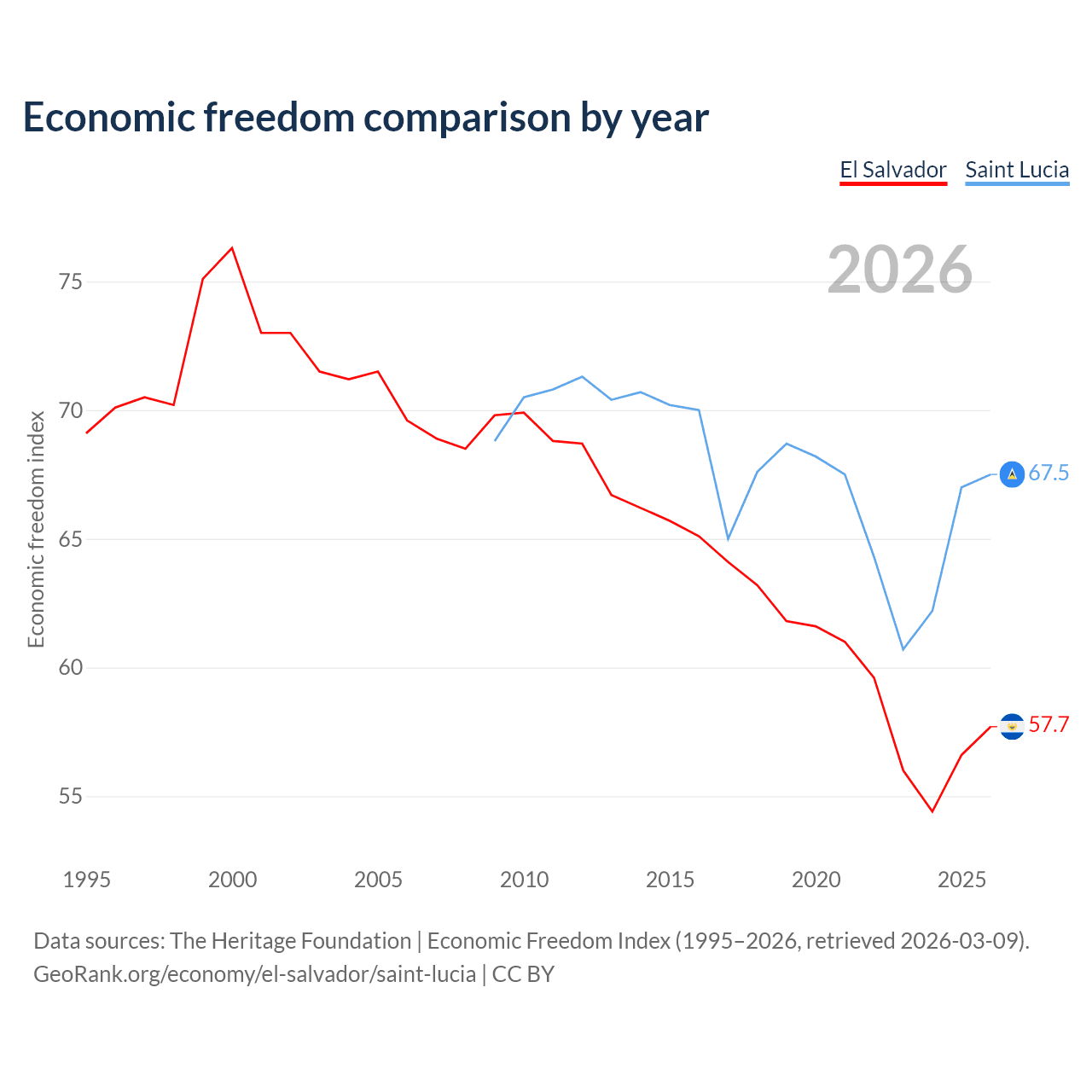 The Economic Freedom Index for El Salvador is 57.7, ranking 114/197, compared to 67.5 for Saint Lucia, ranking 57/197. The chart above displays a comparison of annual changes in economic freedom indexes.