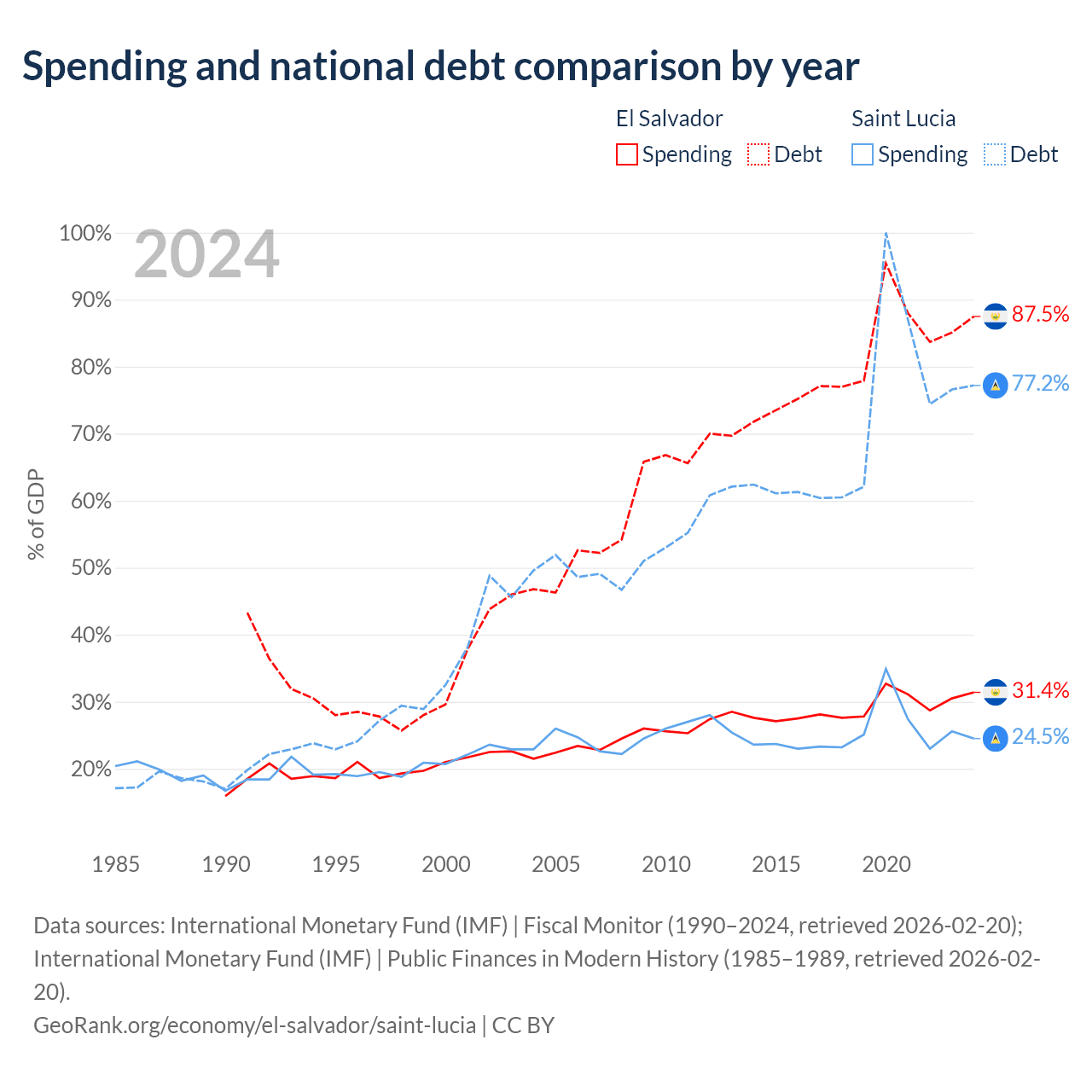 El Salvador has $30.9B in government debt (87.5% of GDP), compared to $1.97B (77.2% of GDP) in Saint Lucia.