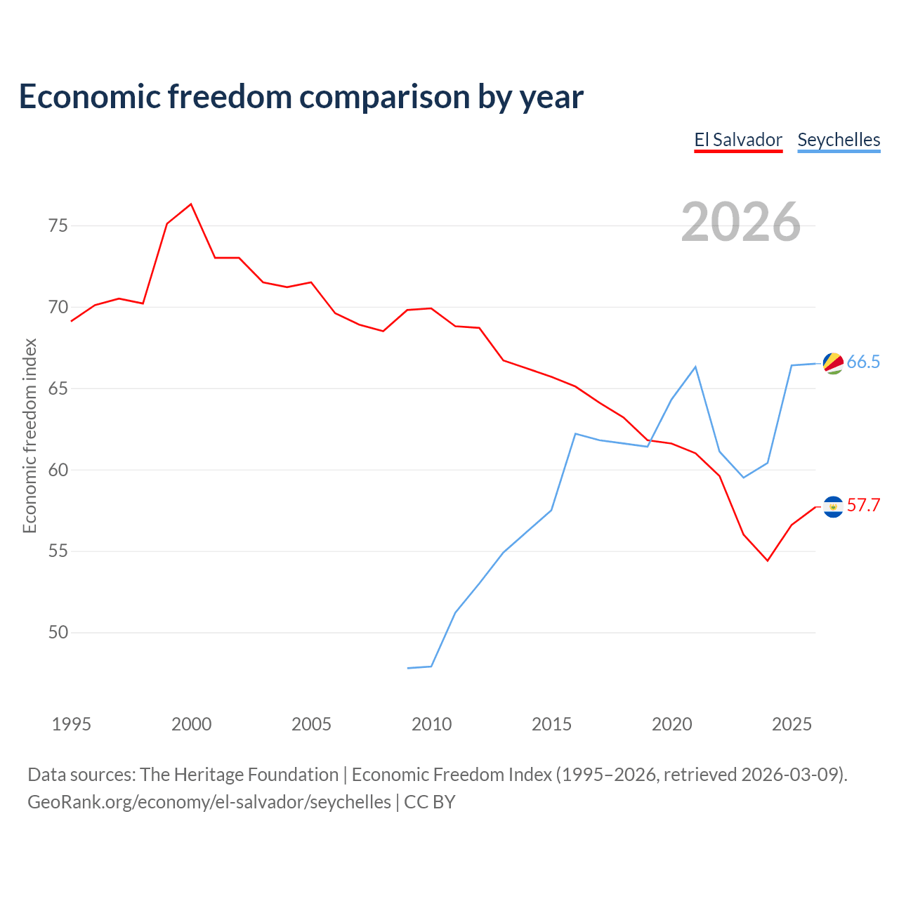 The Economic Freedom Index for El Salvador is 57.7, ranking 114/197, compared to 66.5 for the Seychelles, ranking 60/197. The chart above displays a comparison of annual changes in economic freedom indexes.