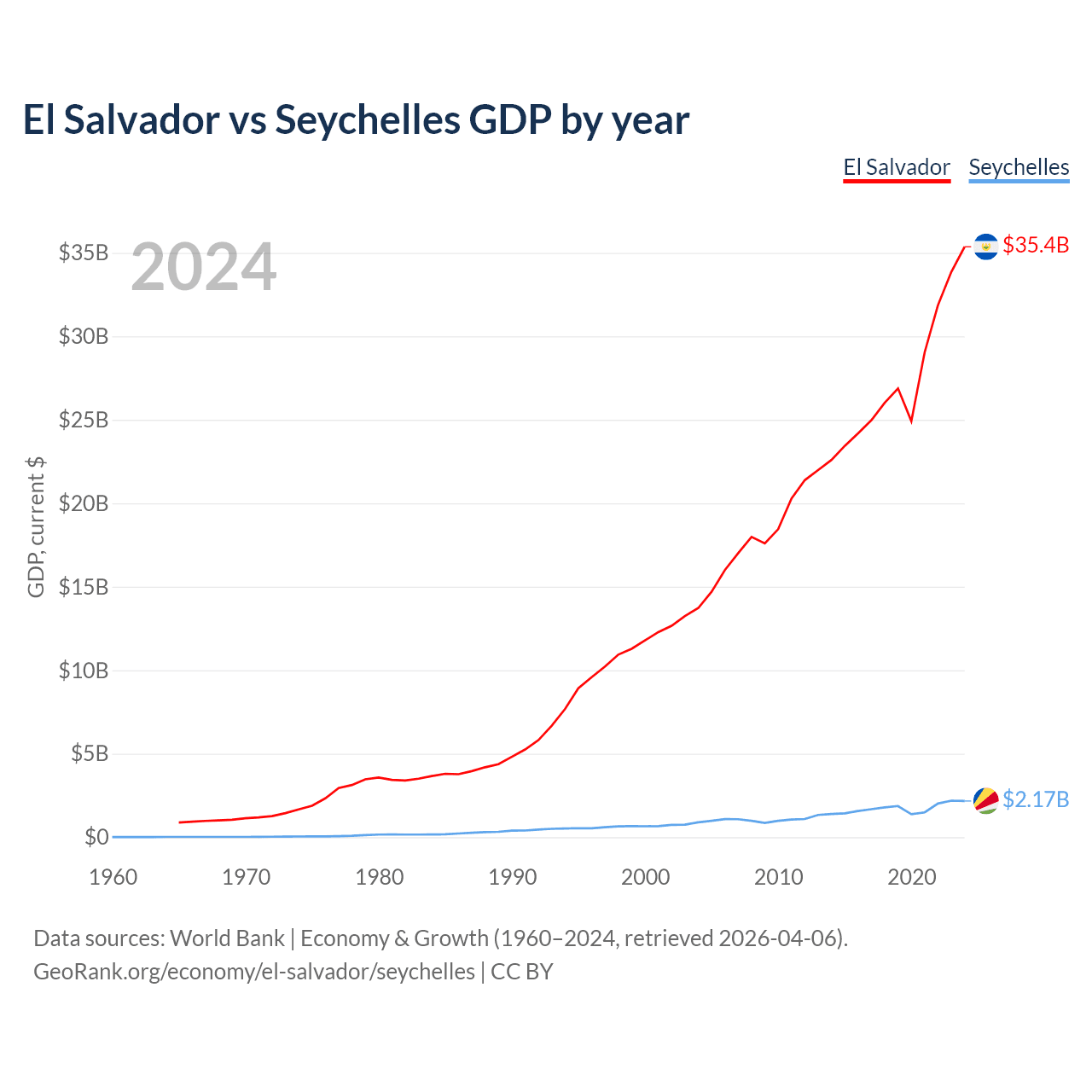 El Salvador has a GDP of $35.4B compared to $2.17B for the Seychelles, ranking 105/197 and 178/197 by economy size, respectively.