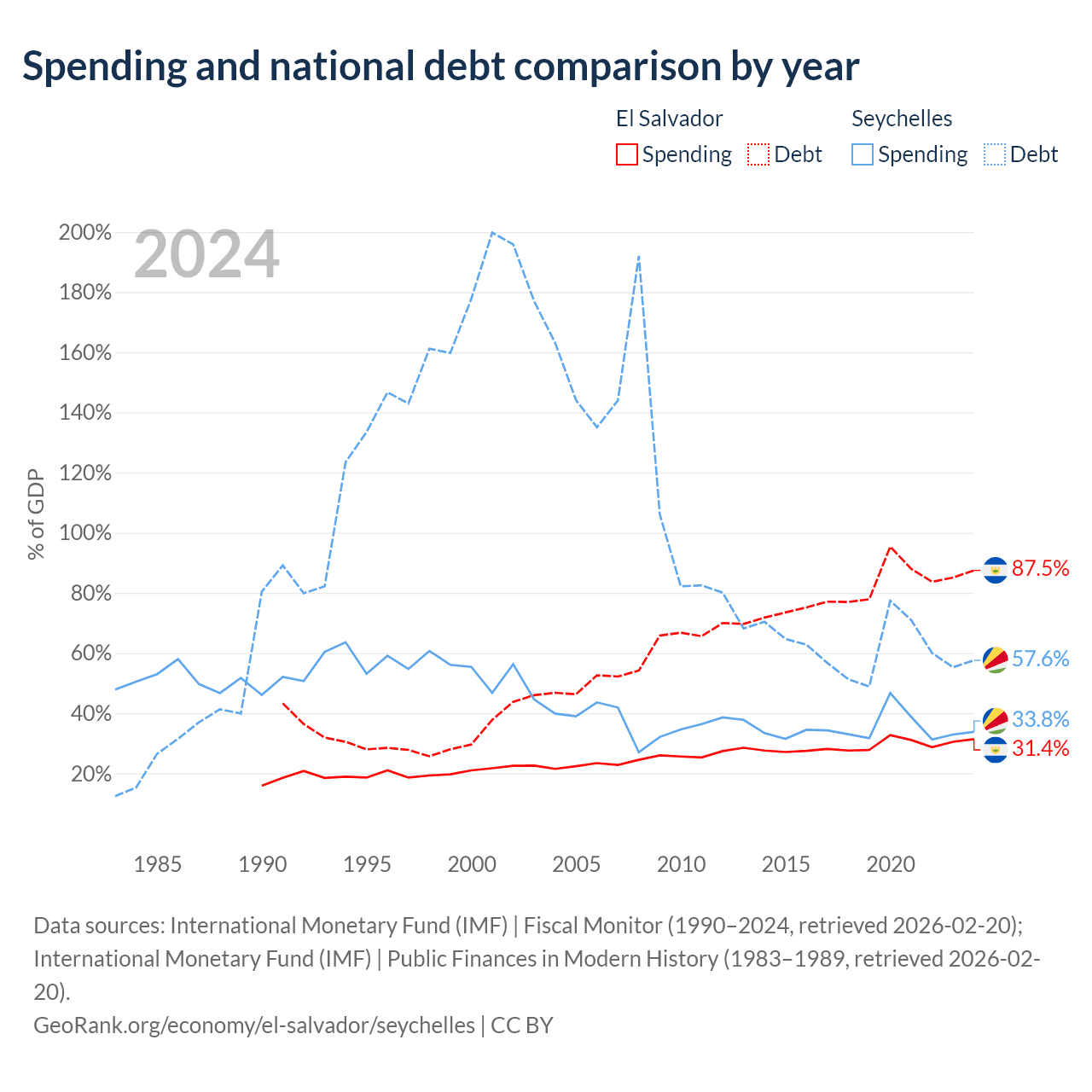 El Salvador has $30.9B in government debt (87.5% of GDP), compared to $1.25B (57.6% of GDP) in the Seychelles.