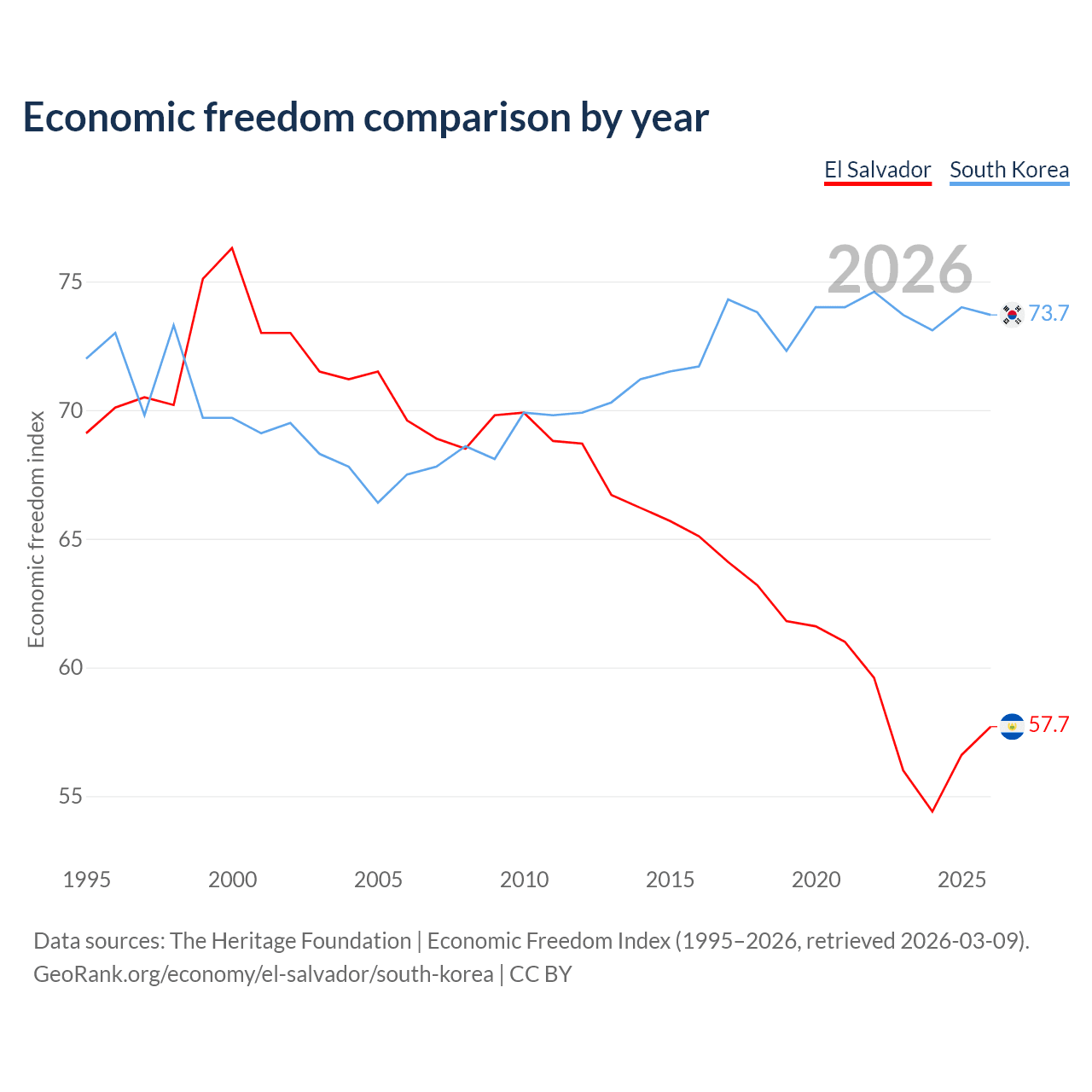 The Economic Freedom Index for El Salvador is 57.7, ranking 114/197, compared to 73.7 for South Korea, ranking 24/197. The chart above displays a comparison of annual changes in economic freedom indexes.