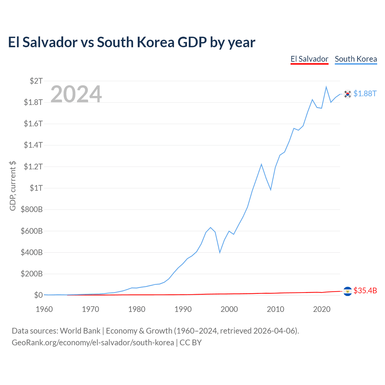 El Salvador has a GDP of $35.4B compared to $1.88T for South Korea, ranking 105/197 and 12/197 by economy size, respectively.