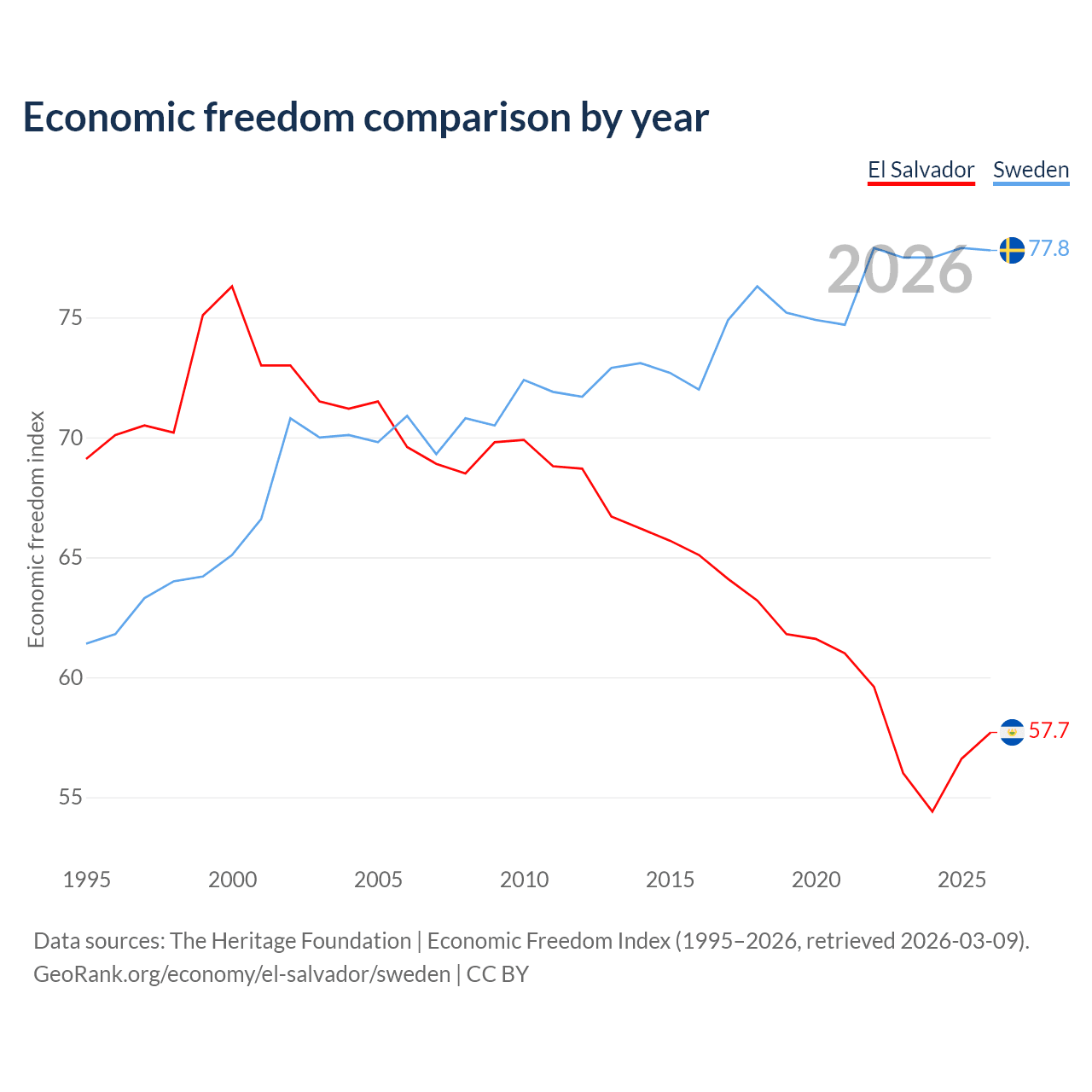 The Economic Freedom Index for El Salvador is 57.7, ranking 114/197, compared to 77.8 for Sweden, ranking 14/197. The chart above displays a comparison of annual changes in economic freedom indexes.