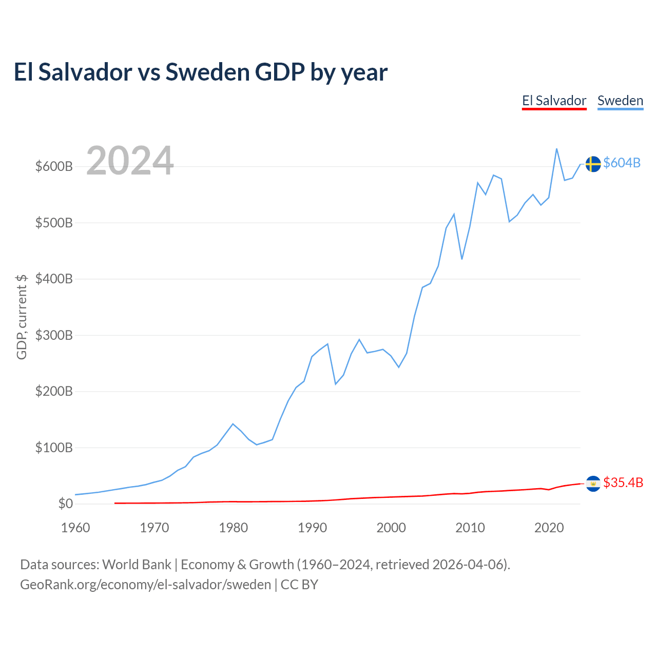 El Salvador has a GDP of $35.4B compared to $604B for Sweden, ranking 105/197 and 26/197 by economy size, respectively.