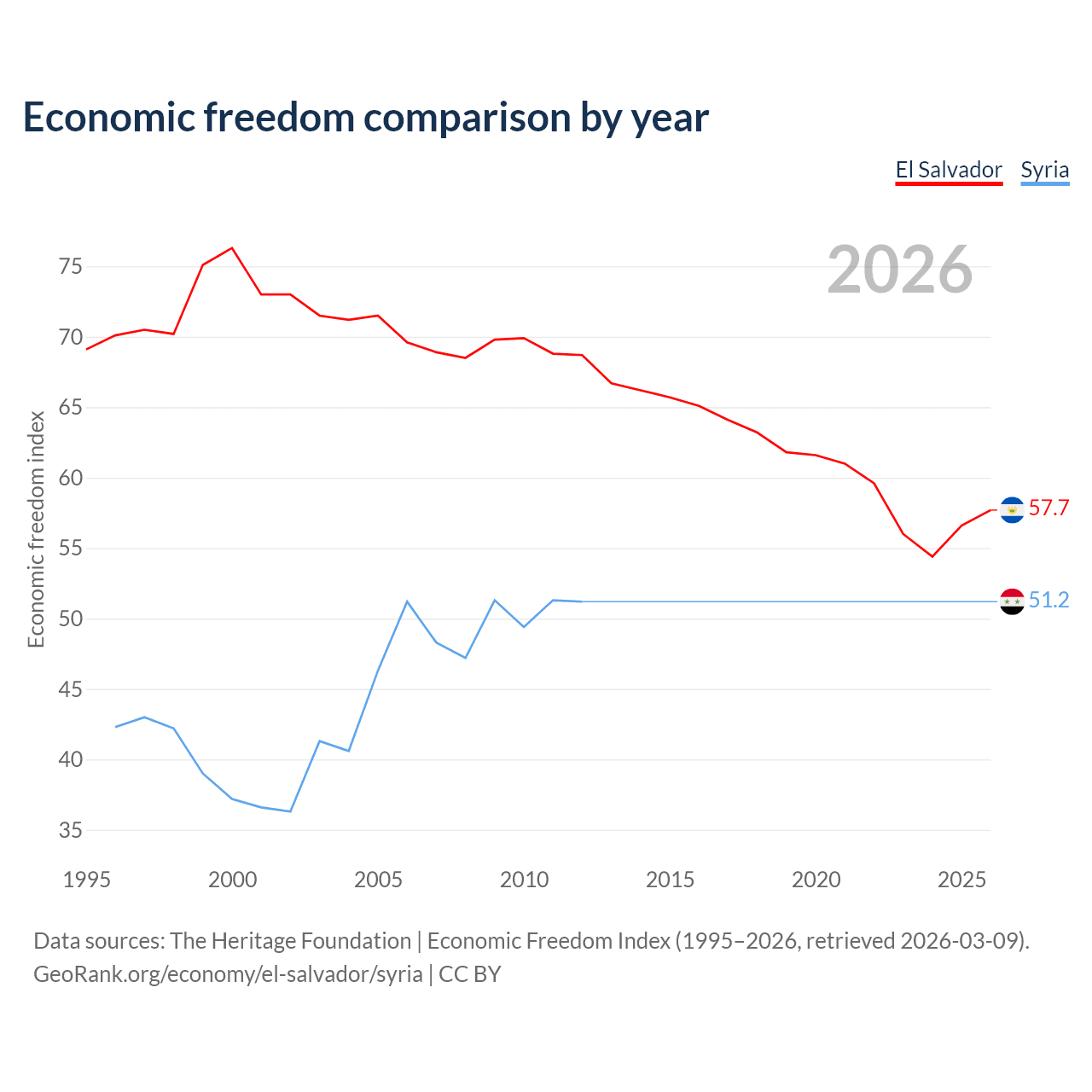 The Economic Freedom Index for El Salvador is 57.7, ranking 114/197, compared to 51.2 for Syria, ranking 155/197. The chart above displays a comparison of annual changes in economic freedom indexes.