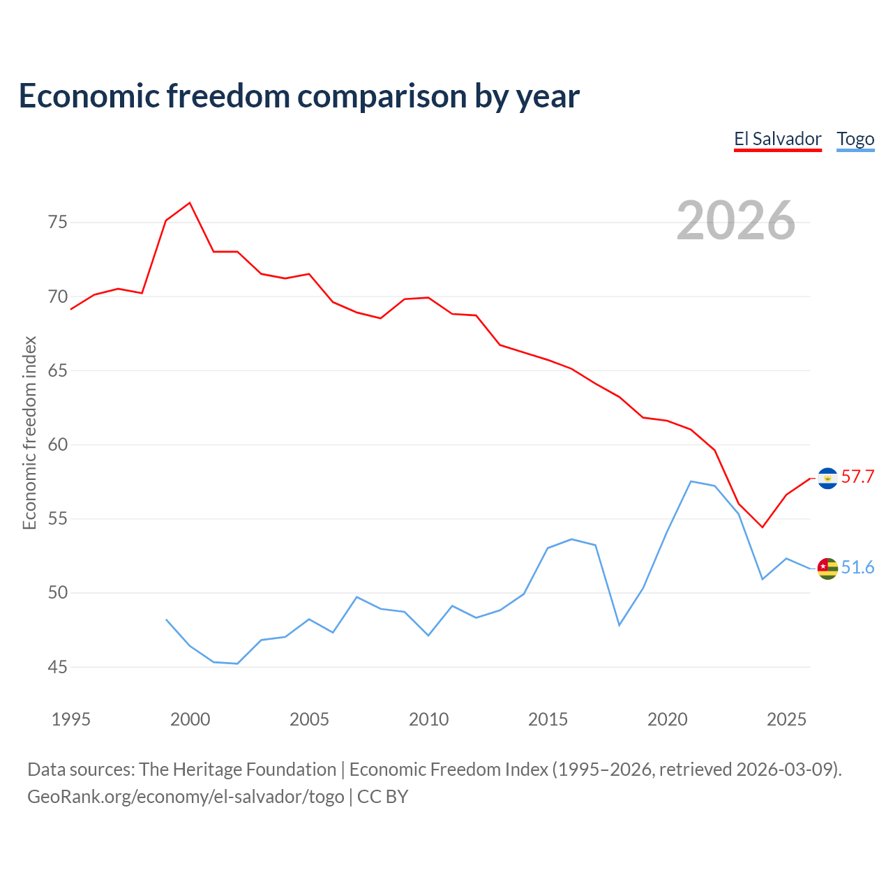 The Economic Freedom Index for El Salvador is 57.7, ranking 114/197, compared to 51.6 for Togo, ranking 153/197. The chart above displays a comparison of annual changes in economic freedom indexes.