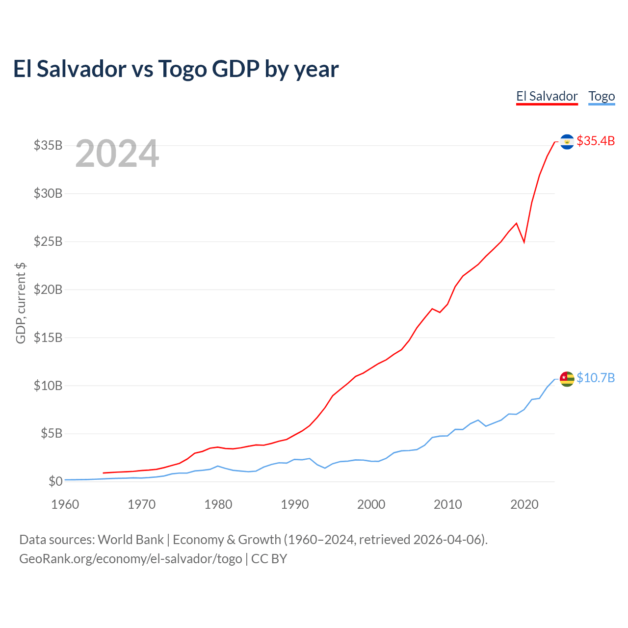 El Salvador has a GDP of $35.4B compared to $10.7B for Togo, ranking 105/197 and 154/197 by economy size, respectively.