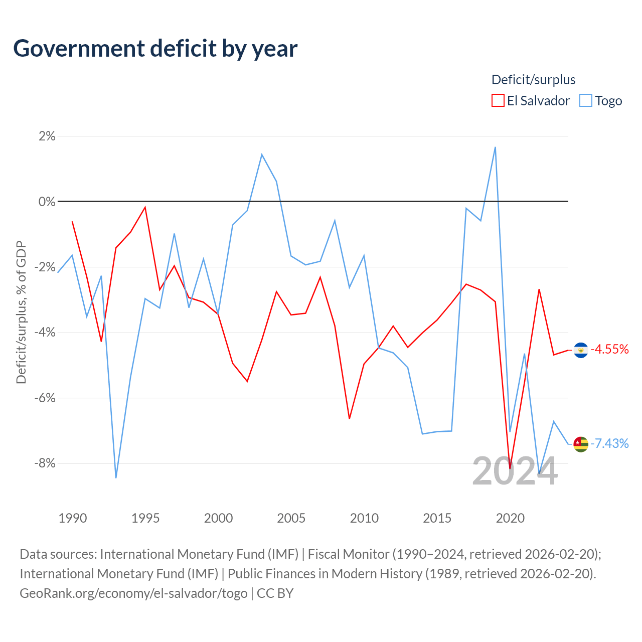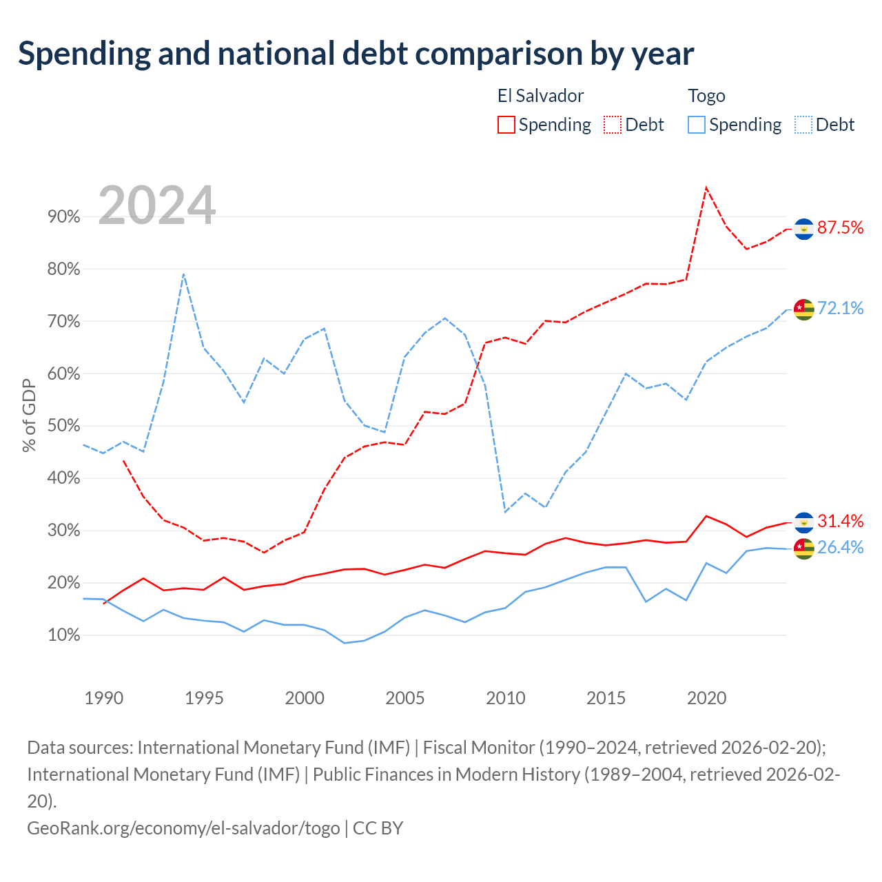El Salvador has $30.9B in government debt (87.5% of GDP), compared to $7.68B (72.1% of GDP) in Togo.