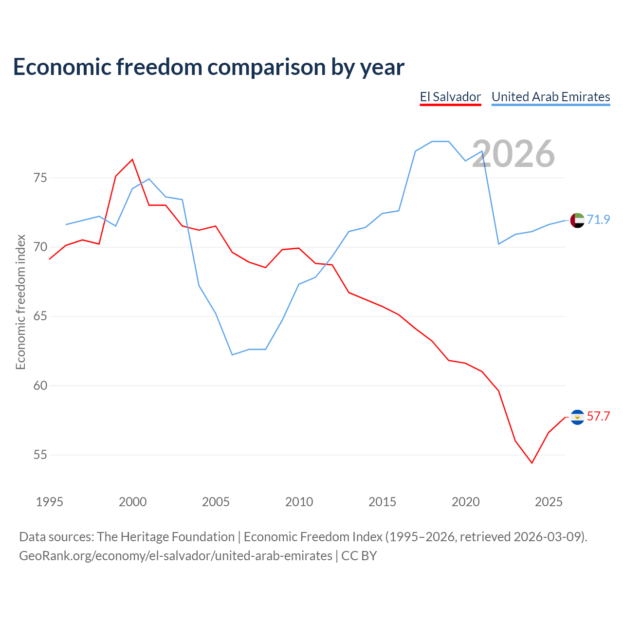 The Economic Freedom Index for El Salvador is 57.7, ranking 114/197, compared to 71.9 for the United Arab Emirates, ranking 29/197. The chart above displays a comparison of annual changes in economic freedom indexes.