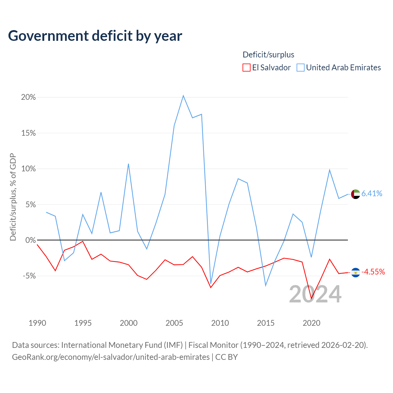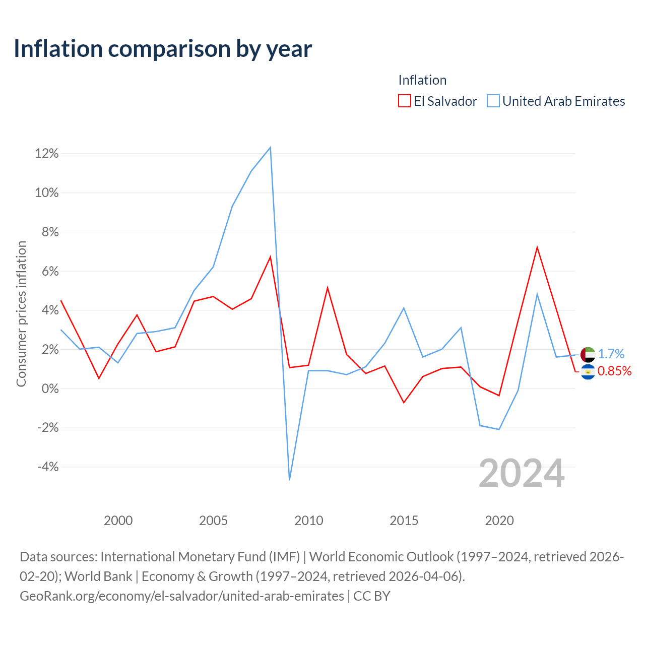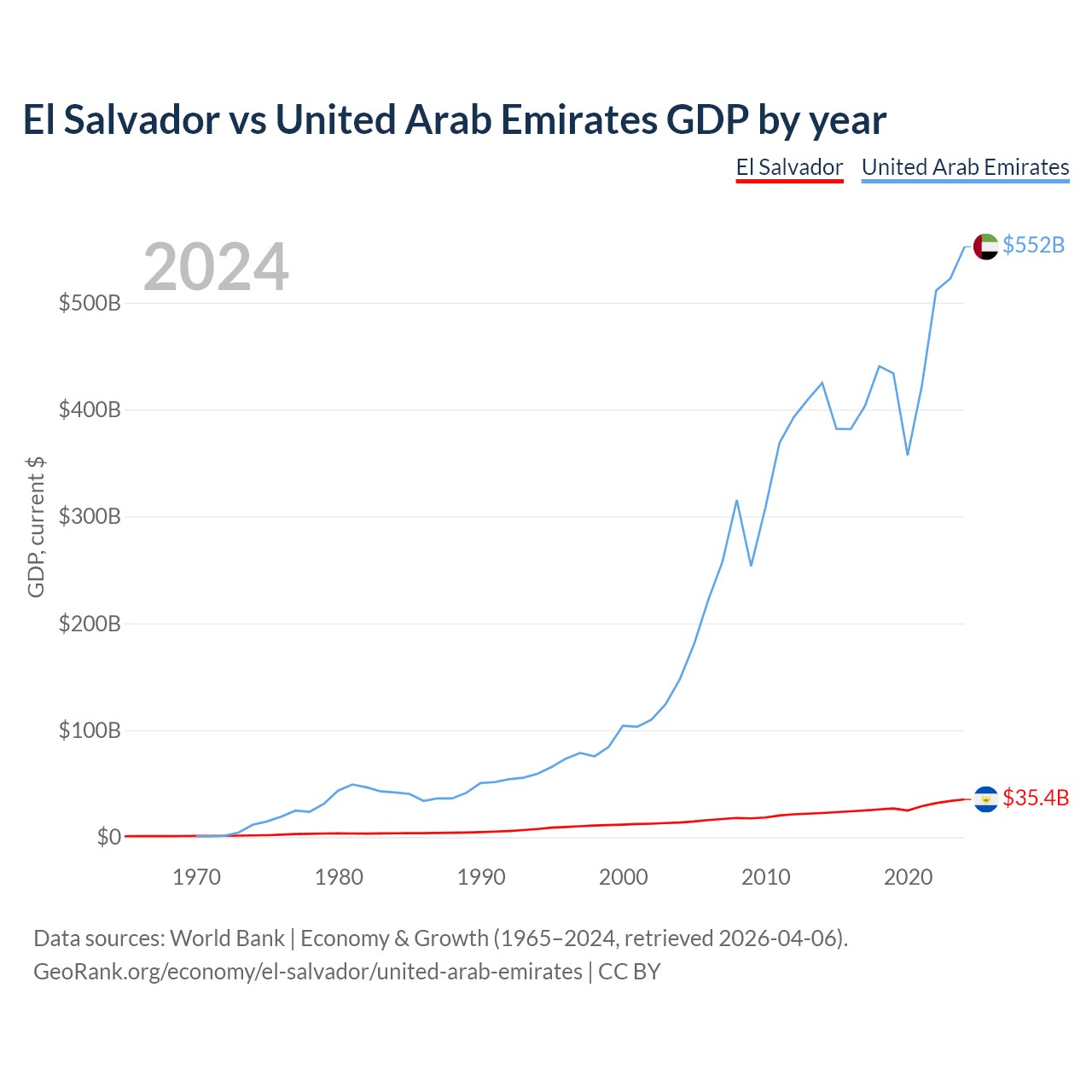 El Salvador has a GDP of $35.4B compared to $552B for the United Arab Emirates, ranking 105/197 and 27/197 by economy size, respectively.