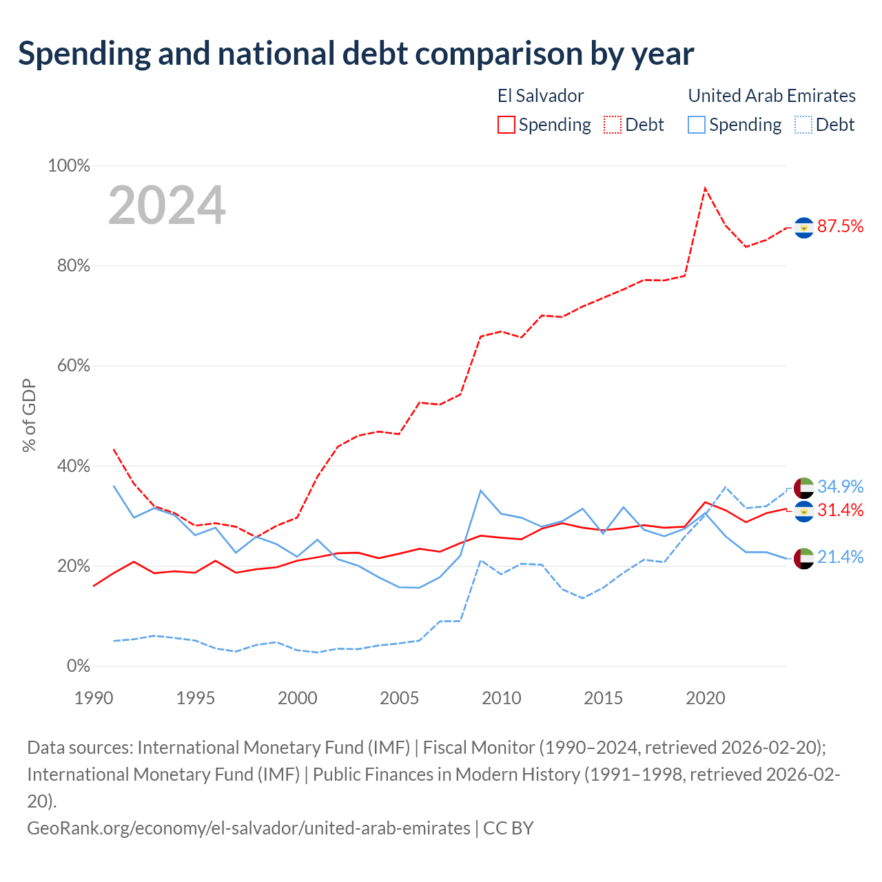 El Salvador has $30.9B in government debt (87.5% of GDP), compared to $193B (34.9% of GDP) in the United Arab Emirates.