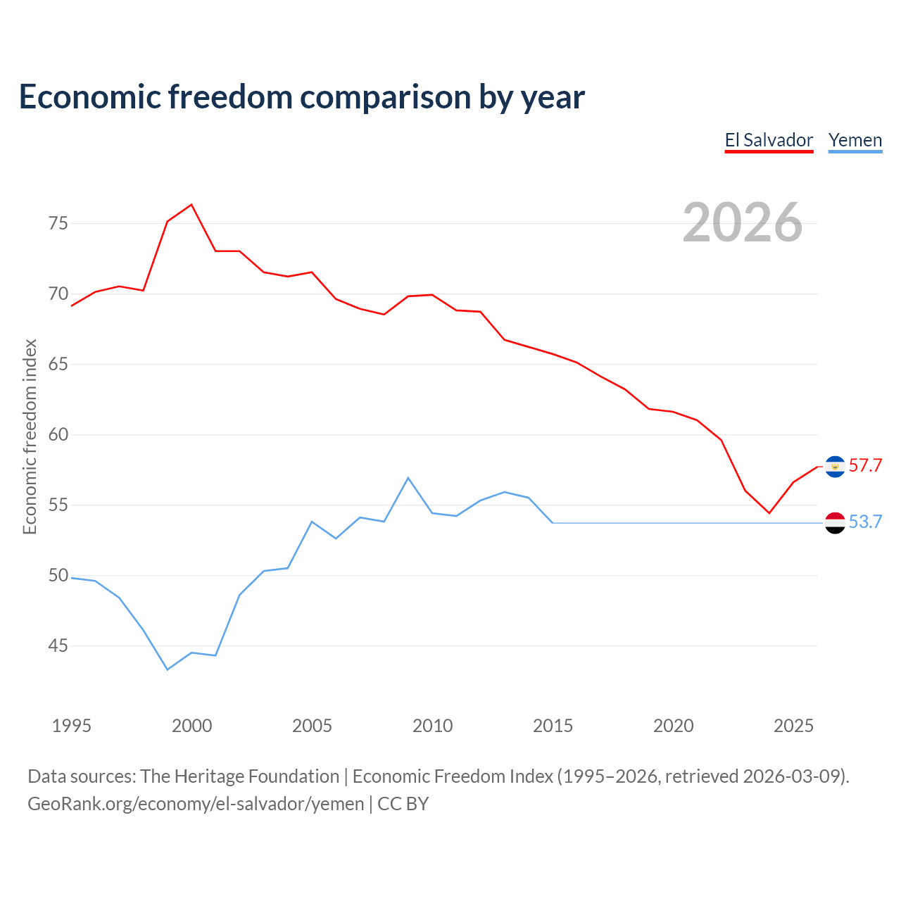 The Economic Freedom Index for El Salvador is 57.7, ranking 114/197, compared to 53.7 for Yemen, ranking 138/197. The chart above displays a comparison of annual changes in economic freedom indexes.