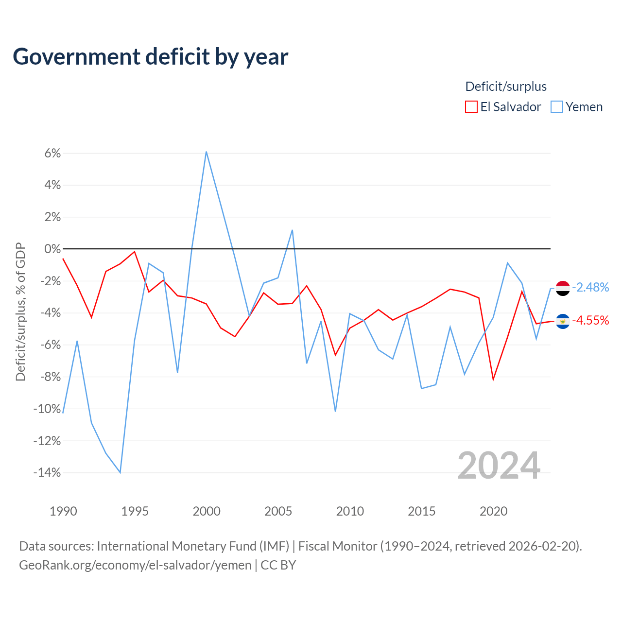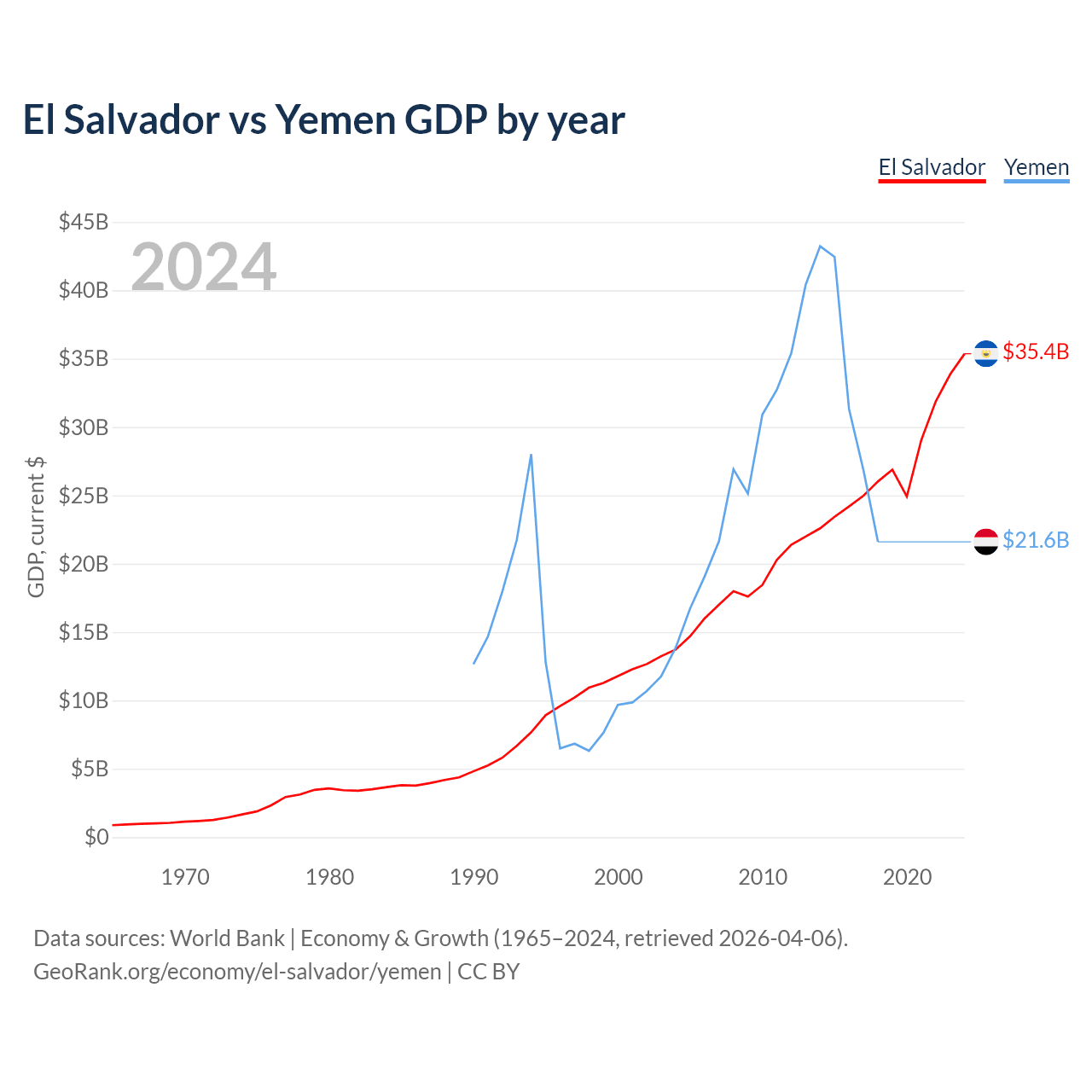 El Salvador has a GDP of $35.4B compared to $21.6B for Yemen, ranking 105/197 and 125/197 by economy size, respectively.