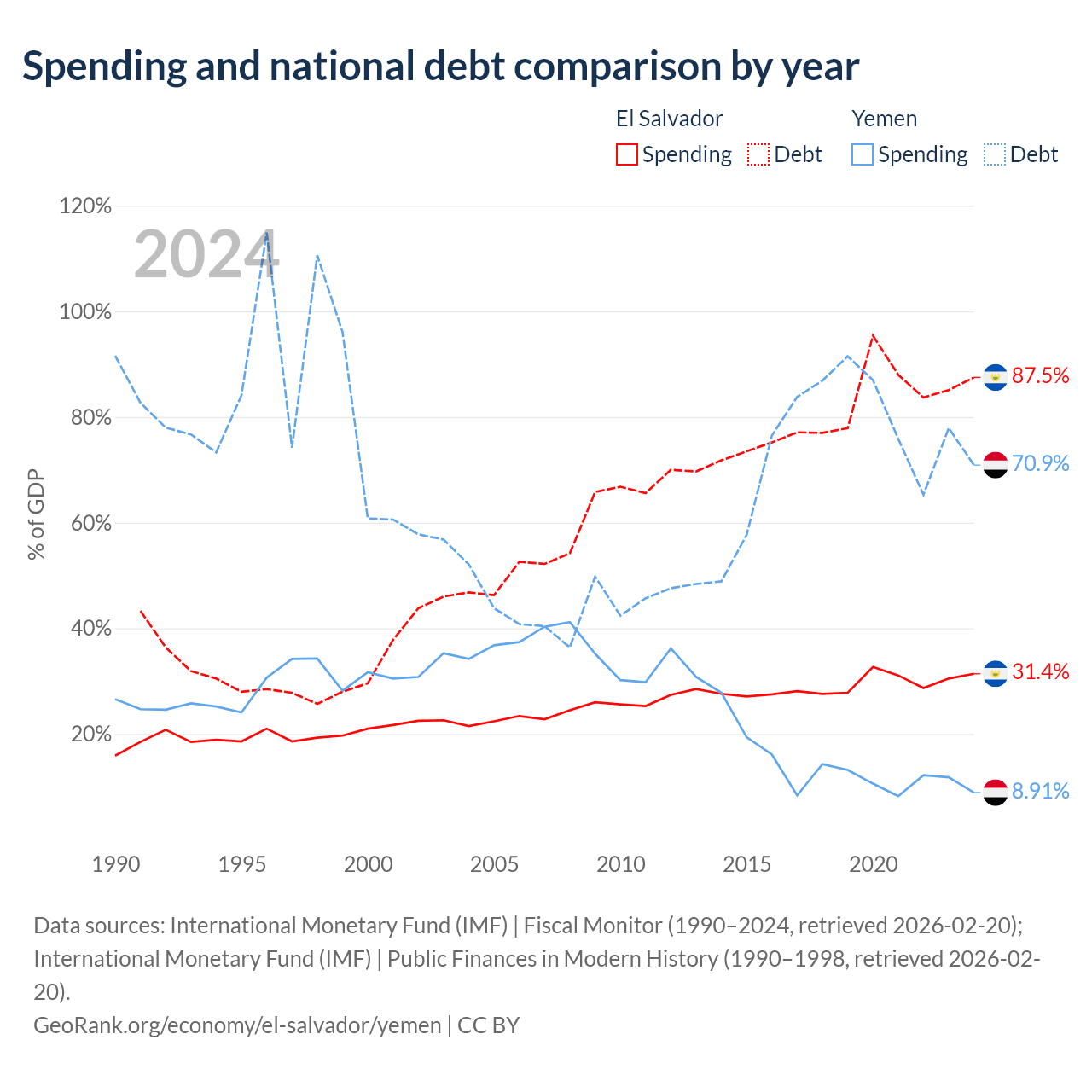 El Salvador has $30.9B in government debt (87.5% of GDP), compared to $18.8B (70.9% of GDP) in Yemen.